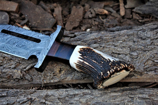 Rambo Knife for Sale - Custom Handmade Damascus Bowie with Rose Wood & Antler Horn