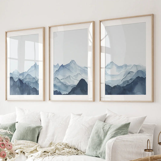 Blue Misty Mountain Scenery. Set of 3 Prints