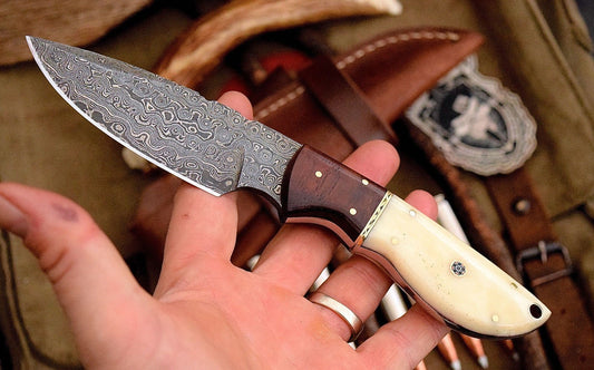 Custom Handmade Damascus Great Skinning Knife with Bone Handle, 8.25-inch