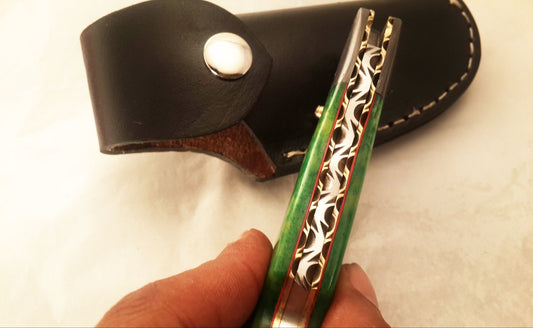 Best Folding Pocket Knife with Buffalo Horn and Color Wood Spacers Handle, 3 Inches Blade Length and Leather Case - For Sale by KBS Knives Store.
