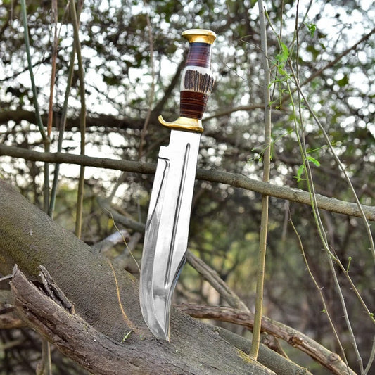 Premium D2 Steel Bowie Knife - 16" Overall, 11" Blade, Antler Horn Handle, Stacked Leather & Brass Guards