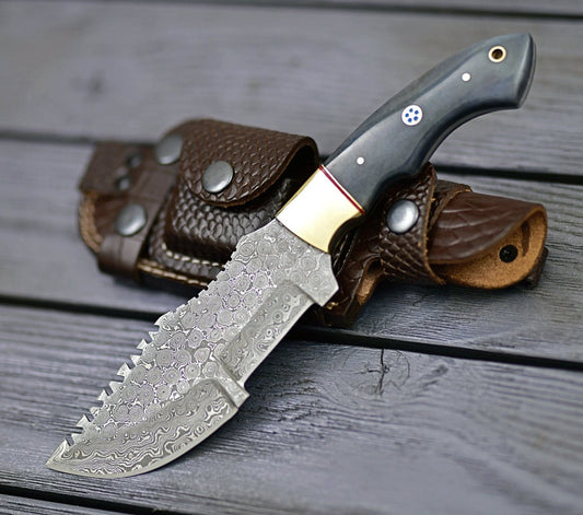 Serenity Damascus Hunting Knife with Stacked Leather Handle