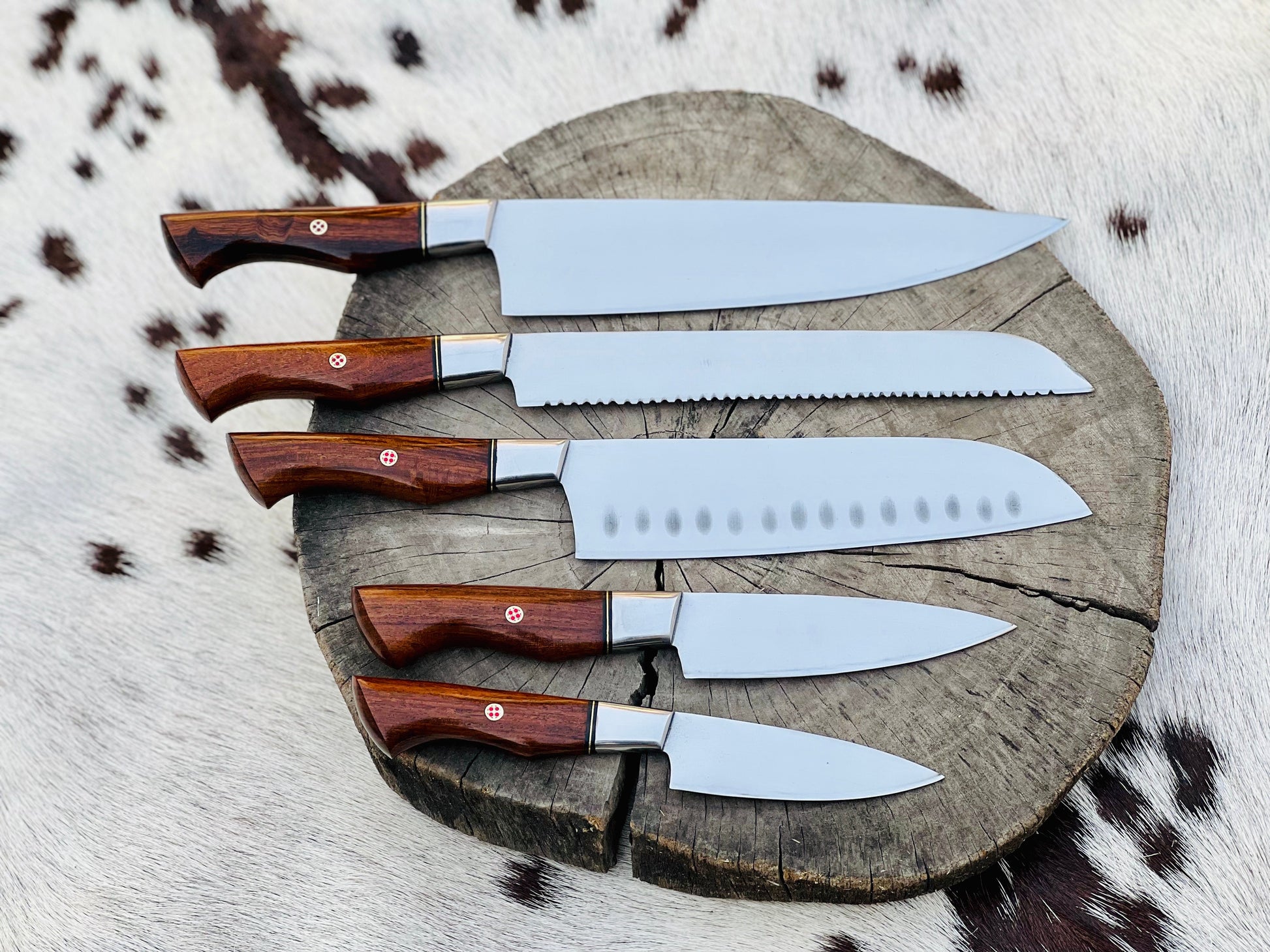 5 Piece Custom Handmade Stainless Steel Kitchen Knives Set with Leather Roll and Rosewood Handles" by KBS Knives Store