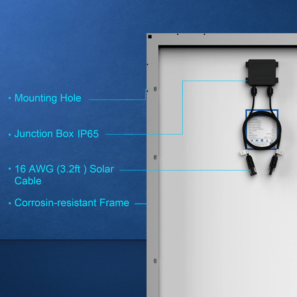 Ensuring durability, the panel is equipped with a junction box at the rear, boasting an IP65 water-resistance rating. This enhances its resistance to environmental elements, making it suitable for various outdoor settings. Additionally, the panel comes with a 3.2-foot, 16 AWG cable featuring male and female quick connectors for convenient and secure connectivity. Harness the power of the sun effortlessly with the ACOPower 100-Watt Polycrystalline Solar Panel.