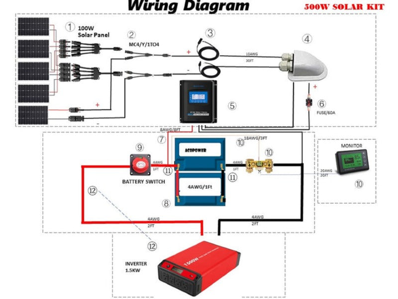 This all-inclusive kit provides everything you need to DIY your solar charge system. The kit includes 5pcs 100 Watt Polycrystalline Solar Panels, 3pcs 100Ah LiFePO4 Deep Cycle Lithium Batteries with Built-in 100A BMS, a 1500W DC to AC Power Inverter, a 60 amp MPPT Solar Charge Controller (with LCD Display), a 60A fuse, a battery switch, a battery monitor, and all the necessary cables and solar mounting Z brackets.