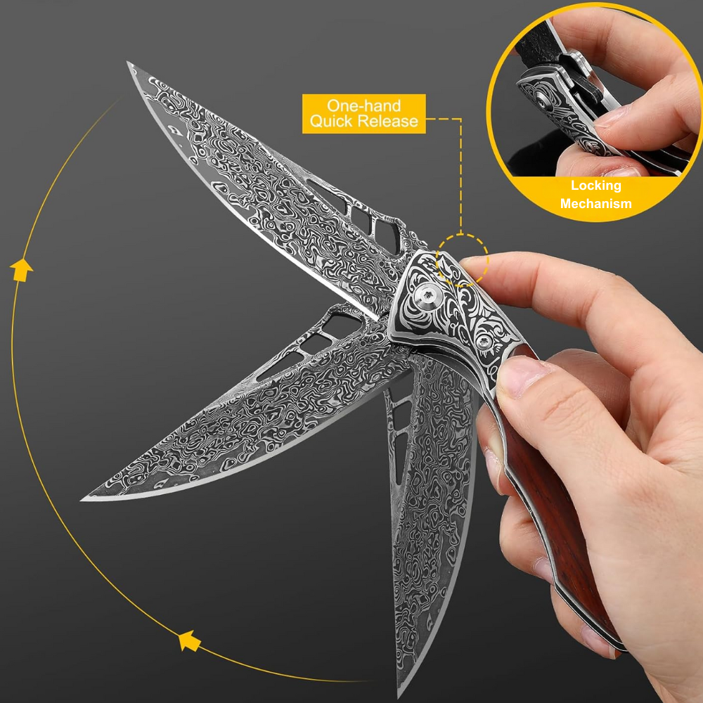 The elegant handle is made using exotic red sandal wood scales. It has been sealed to prevent cracking or drying and preserve the handle for lifetime comes with under lock folding mechanism.