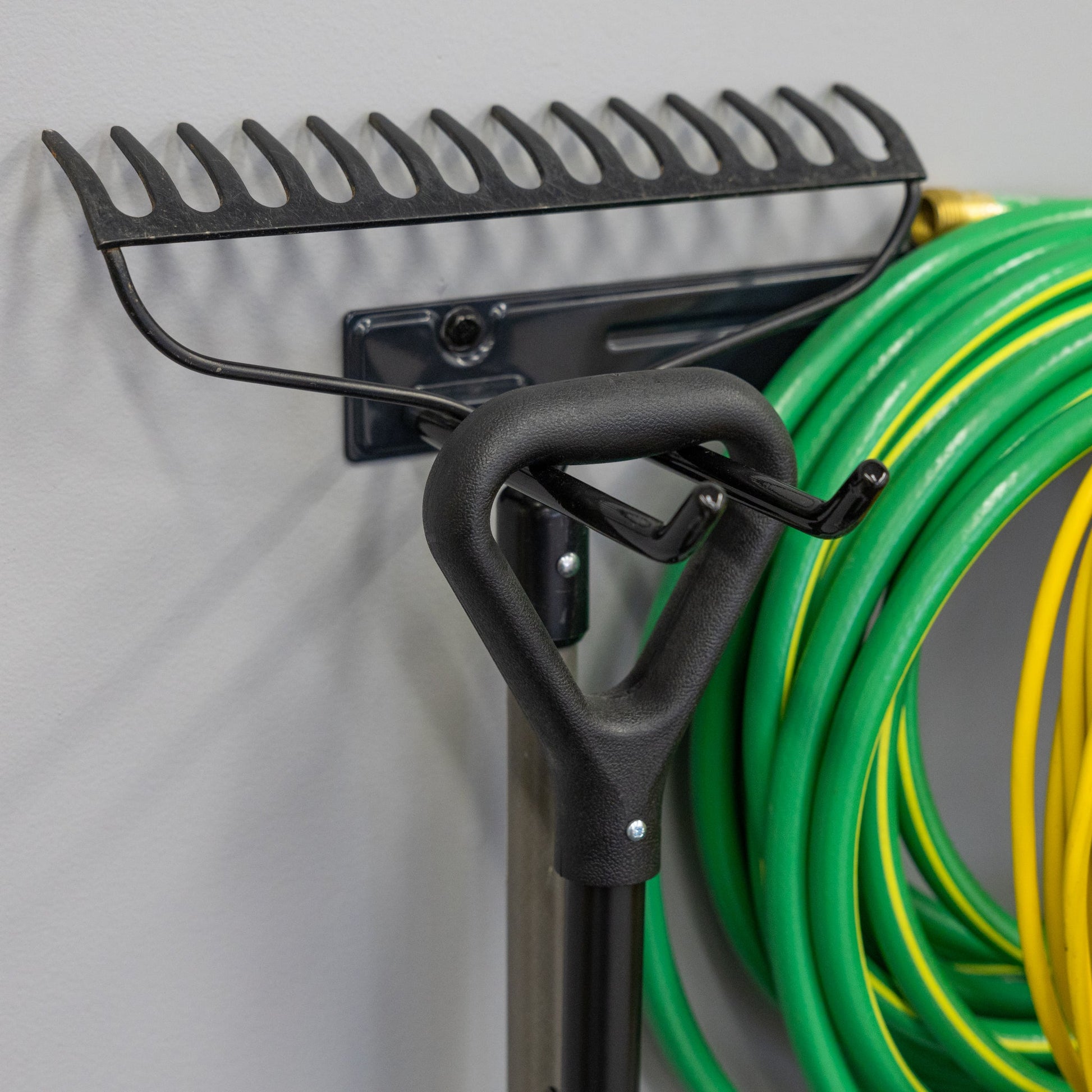 - Organizes yard tools, power equipment, ladders, and more