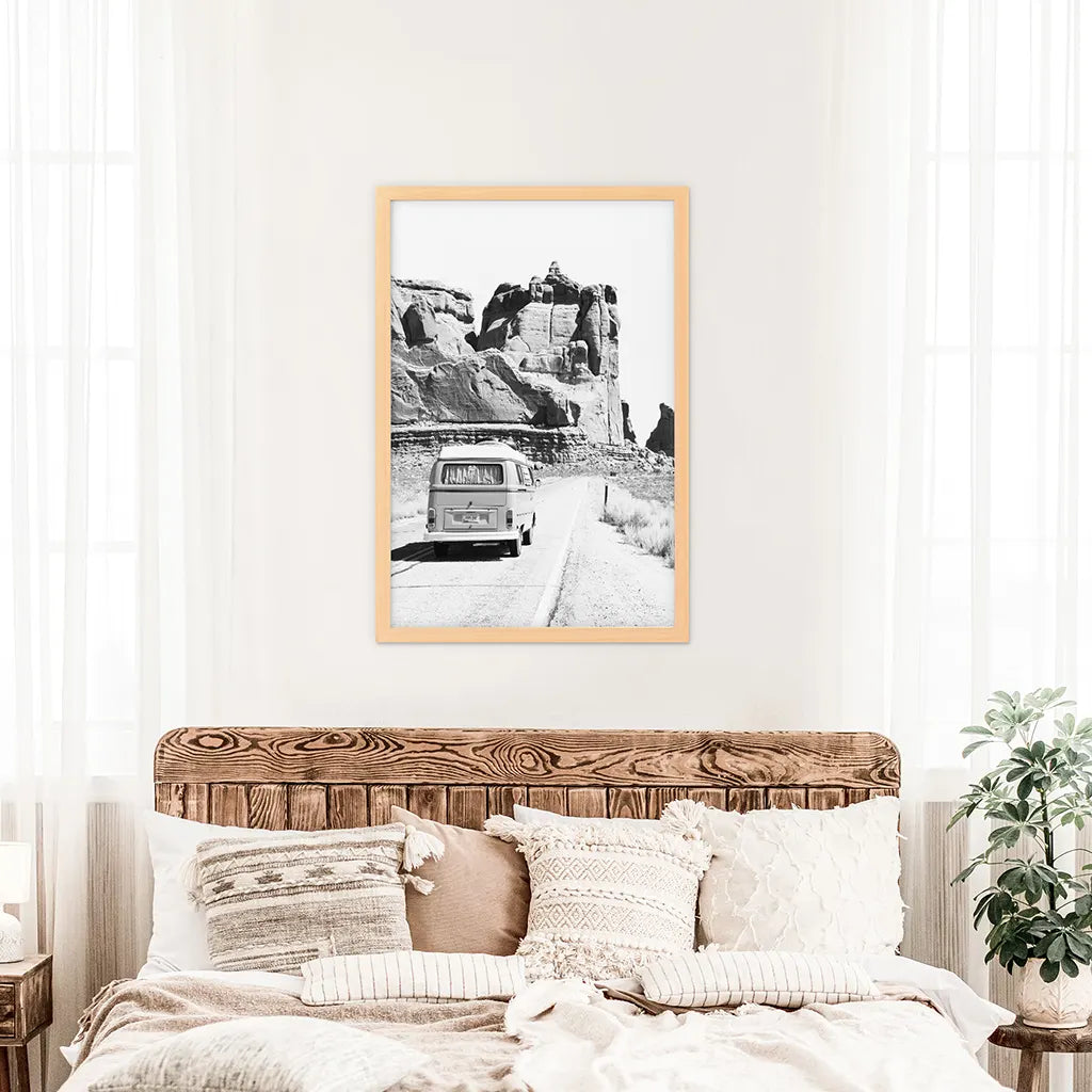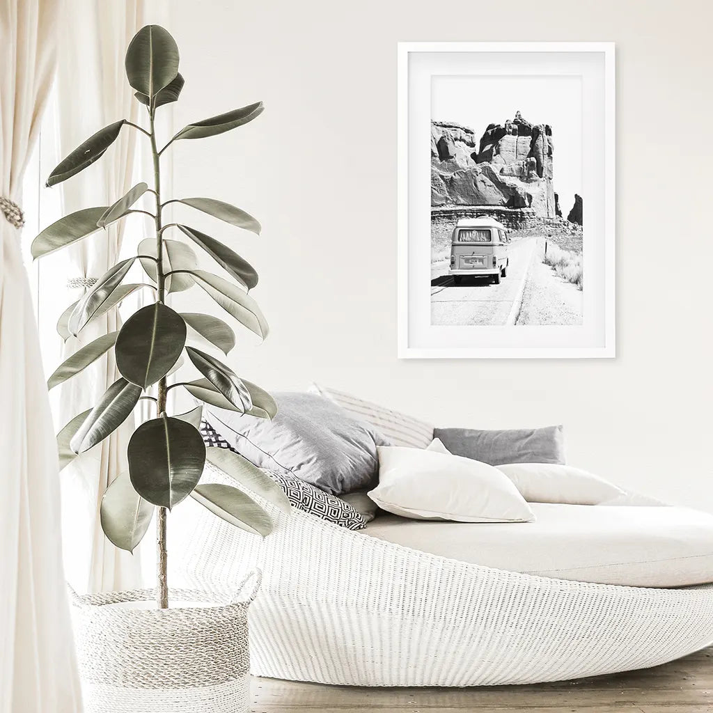 Hang this black and white poster in your home to enjoy this enchanting Utah desert landscape every day. This retro van camper photo will make a great addition to your interior.