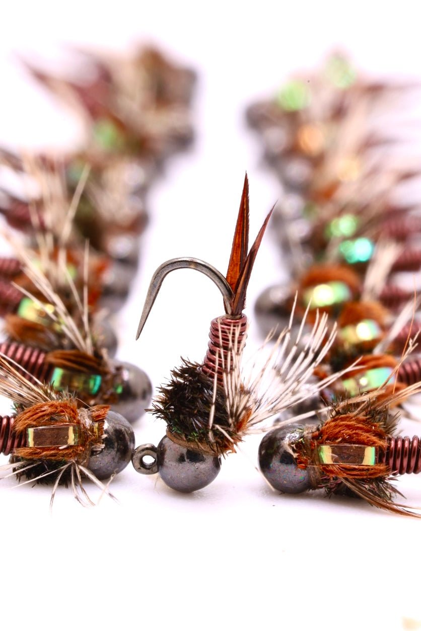 This heavy jig-style nymph throws punches below the surface with a tungsten bead, copper rib, and flashy wing case. Built on a 2X heavy hook, it gets down fast and holds its own in deep runs, fast pockets, and cold shoulders. A go-to pattern when you need weight, movement, and a touch of flash. Trout don’t stand a chance.