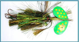 Double 10 Dominatrix Musky Bucktails for Pike and Musky Hunters! DOMINATRIX in-line spinner musky bucktails are made with the finest Northern Pike bucktail terminal tackle around. These Northern Pike bucktails have heavy blades that start spinning more easily and can handle all the abuse you can dish out. Great bucktails for bulging over your favorite weedbeds or trolling your favorite mid water humps or breaks for big trophy Northern Pike. The premium double #10 Colorado spinner blades on these bucktails leave a wake that you have to see to believe. These in-line musky spinner bucktails are a dream for Northern pike and musky hunters young and old. They will get you the attention of many big 50 plus inch Northern Pike and Muskies for years to come. This type of bait is responsible for the MOST big muskys caught in the last few years. We have Northern Pike bucktail lures for stained water to clear and for day or night fishing! Our innovations are your key to success. Quality Northern Pike lures made by the Tackle Industries company and not overpriced!