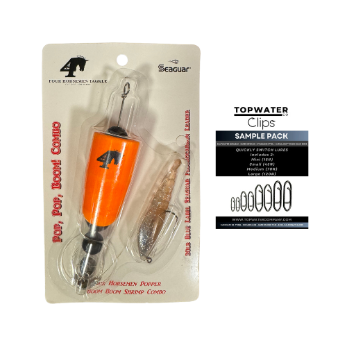 The Pop-Pop-Boom combo includes the 3” Popping Cork, a 34” Seaguar 20lb Blue Label leader, a Boom Boom Shrimp in the Brown Shrimp color, and a Speed Clip Sample Pack!