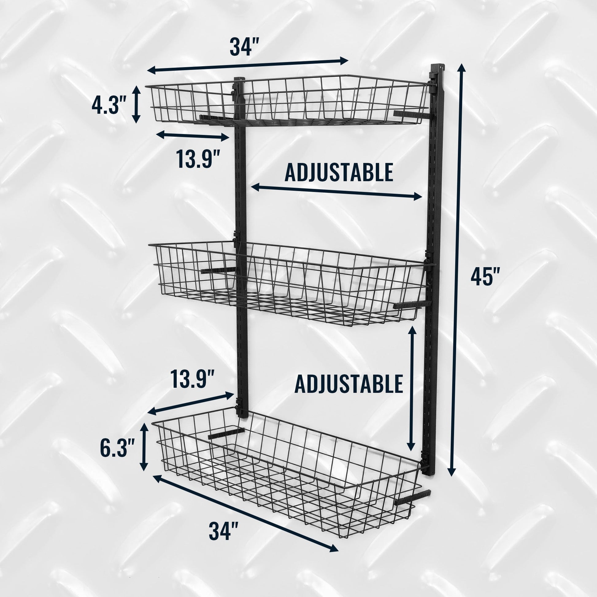 Give your most-used and hard-to-store items a home with this wall basket system. Designed for maximum capacity storage, these powerful wire baskets can handle larger and heavier items than the average basket.