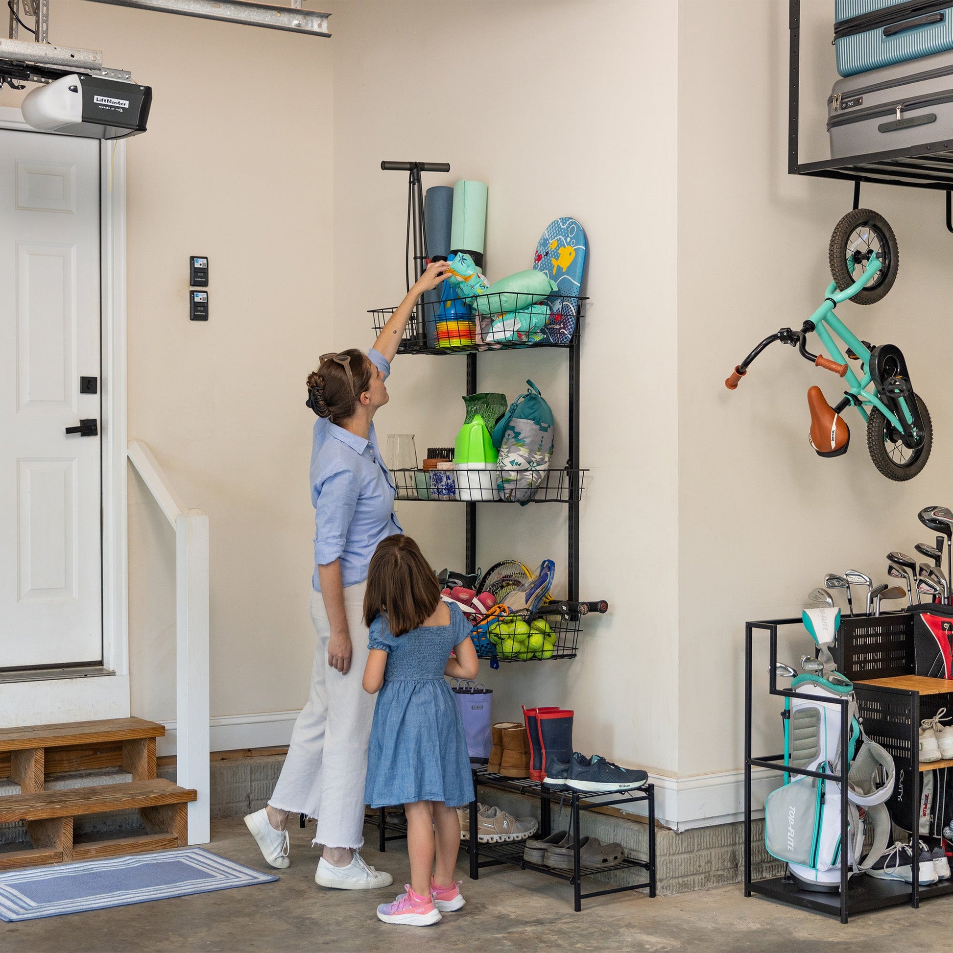 - 3-tiered basket system for organizing sports gear, household items, and more off-the-ground