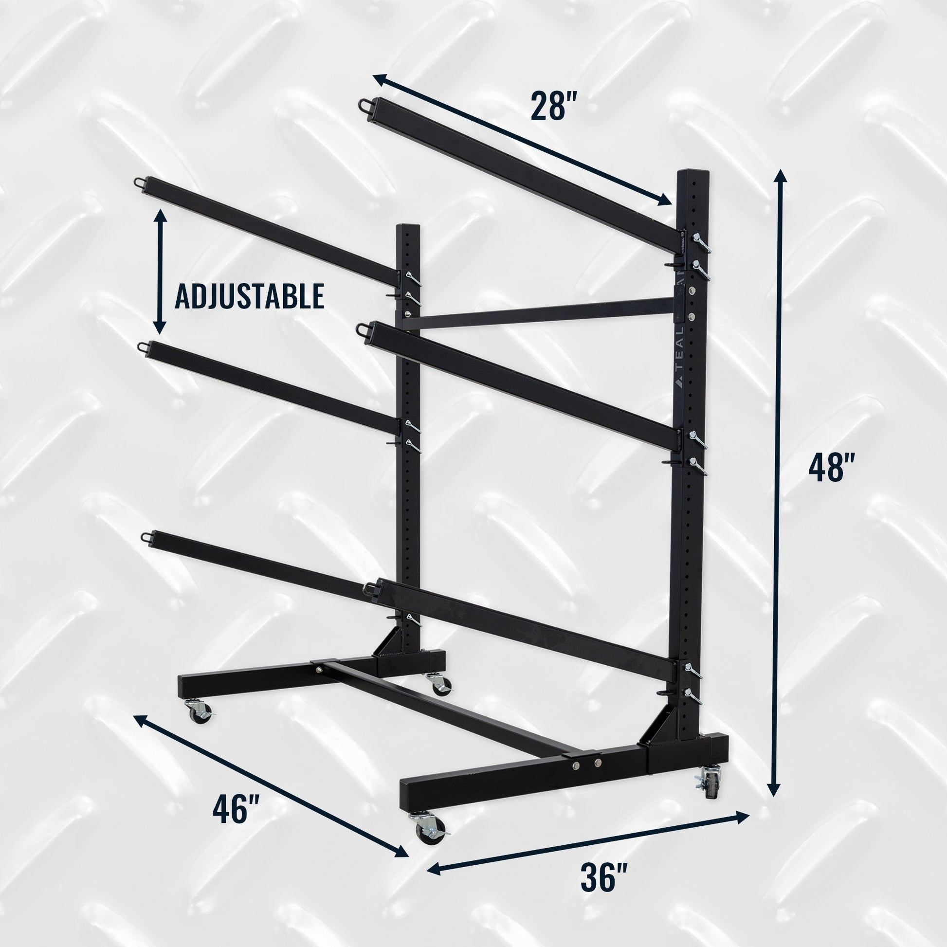 Make kayak storage movable with a wheeled kayak storage rack. This ultra-sturdy rack has 3 levels of watercraft storage, paired with locking caster wheels for easy transport.