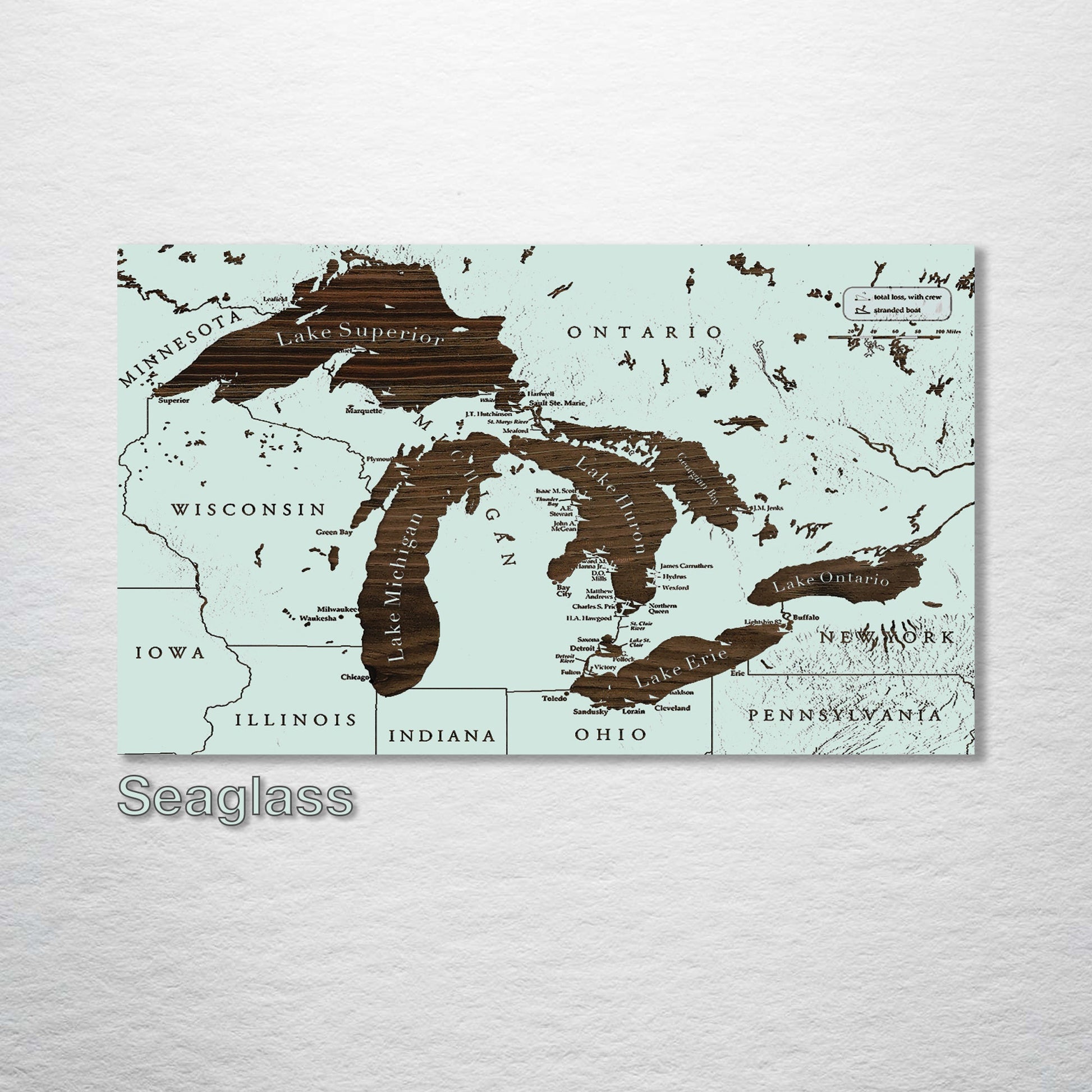 This is a map of the Great Lakes showing many historical shipwrecks designed by Fire & Pine artists.