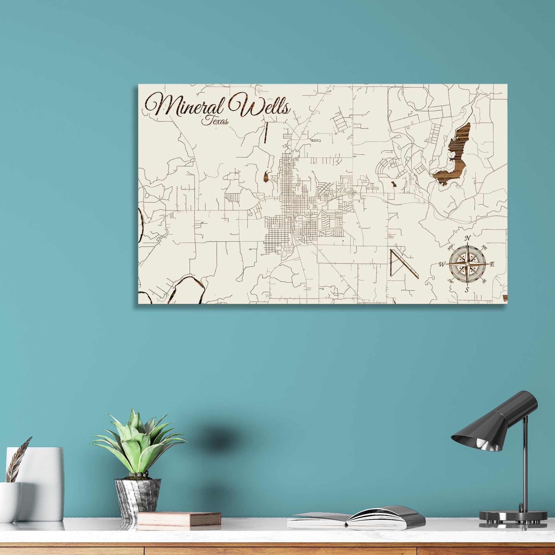 This beautifully detailed, wood-engraved artwork is designed and built from scratch by Fire & Pine artists and craftsmen. 100% of their products are made at their facility in Ridgeland, South Carolina. The map is engraved into durable pine wood, ensuring long-lasting detail and quality. This unique wall art features a street map of Mineral Wells, Texas, and is ideal for cartography enthusiasts, Texas culture aficionados, and those interested in distinctive home accents.