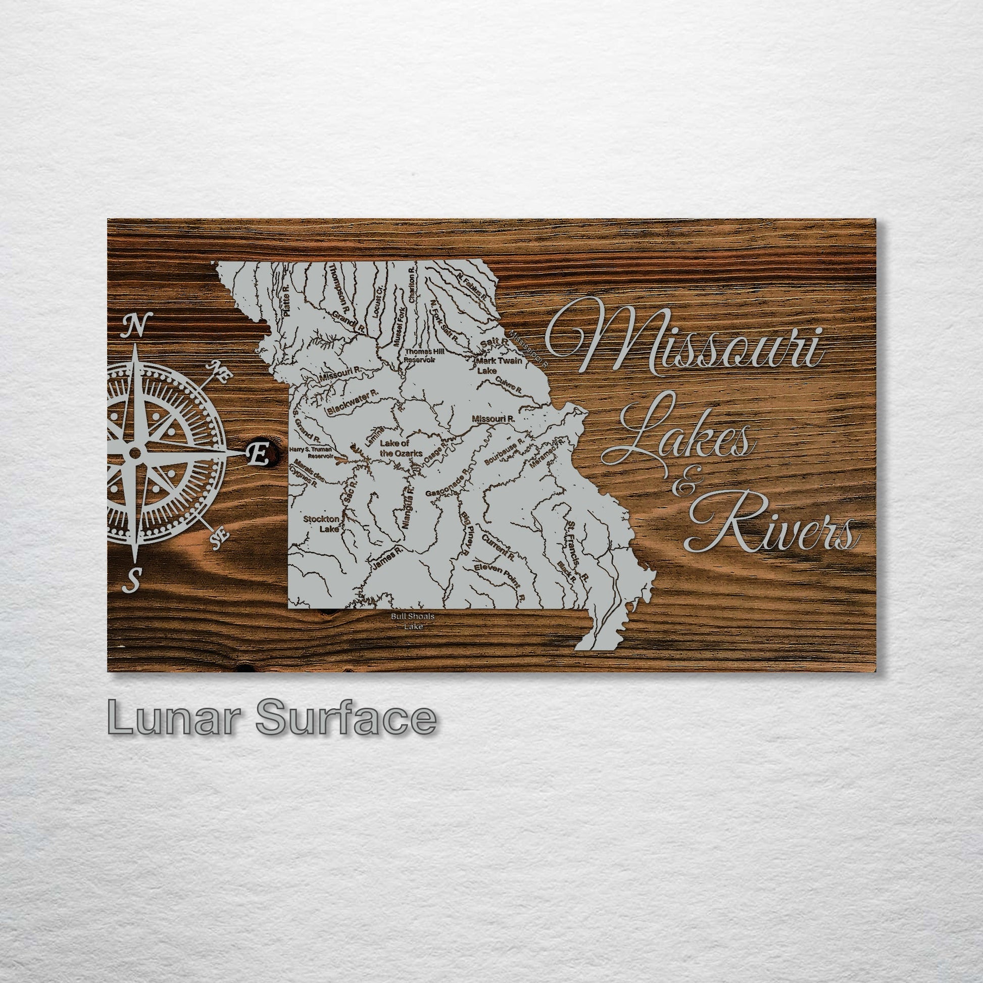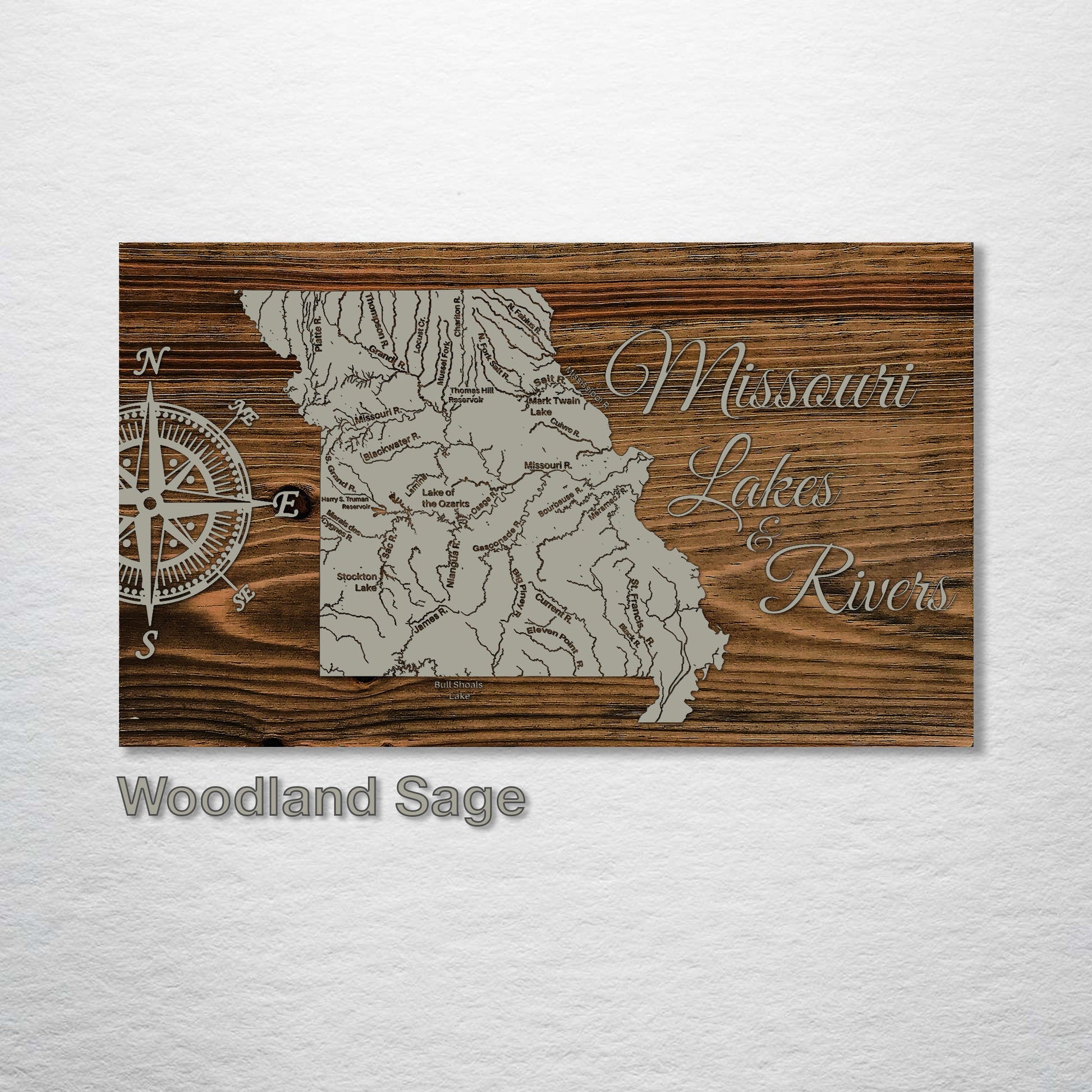 This is a map showing the major lakes & rivers in Missouri designed by Fire & Pine artists.