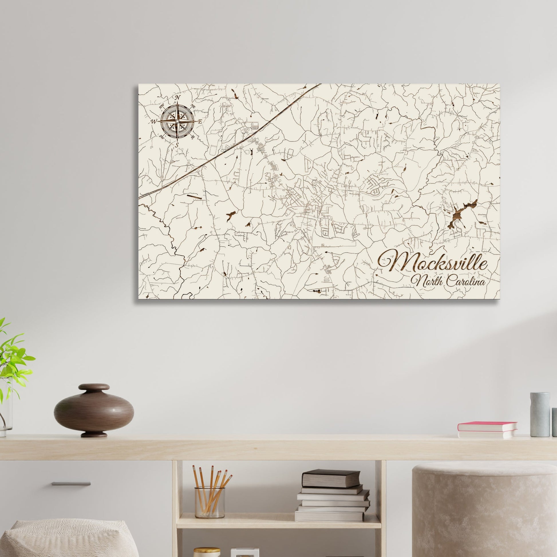 Perfect for Map Enthusiasts: Our Mocksville, North Carolina Street Map is a remarkable work of art, ideal for those who appreciate the beauty and intricacy of city layouts. Crafted with the finest pine wood, this wood-engraved map showcases the unique streets and avenues of Mocksville, making it a perfect addition to any map lover's collection.