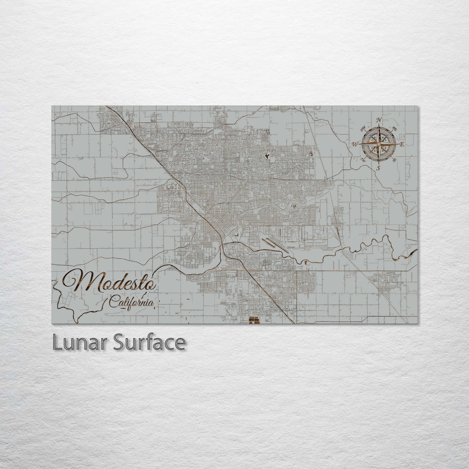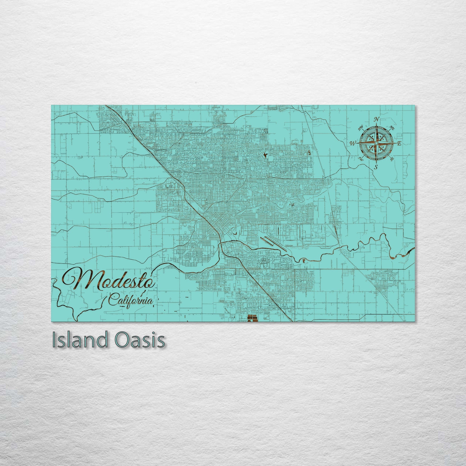 This is a street map of Modesto, CA designed by Fire & Pine artists.