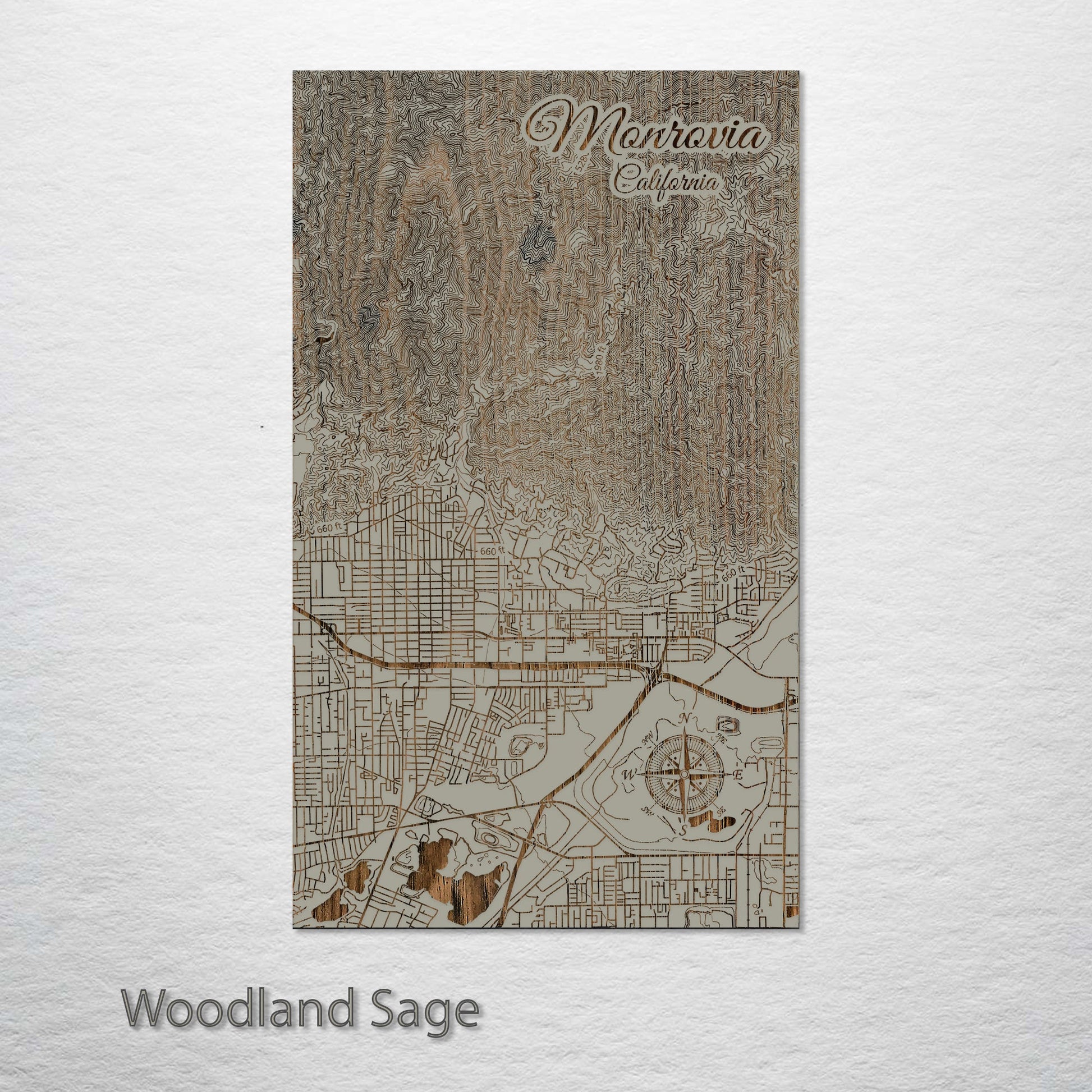 This is a street map of Monrovia, CA designed by Fire & Pine artists.