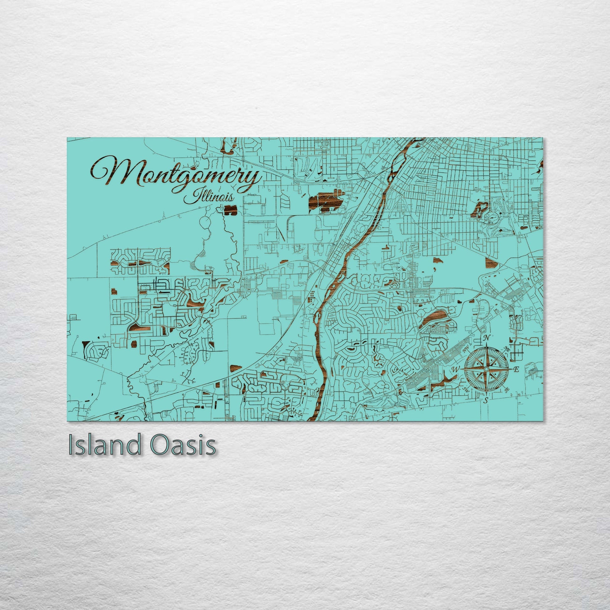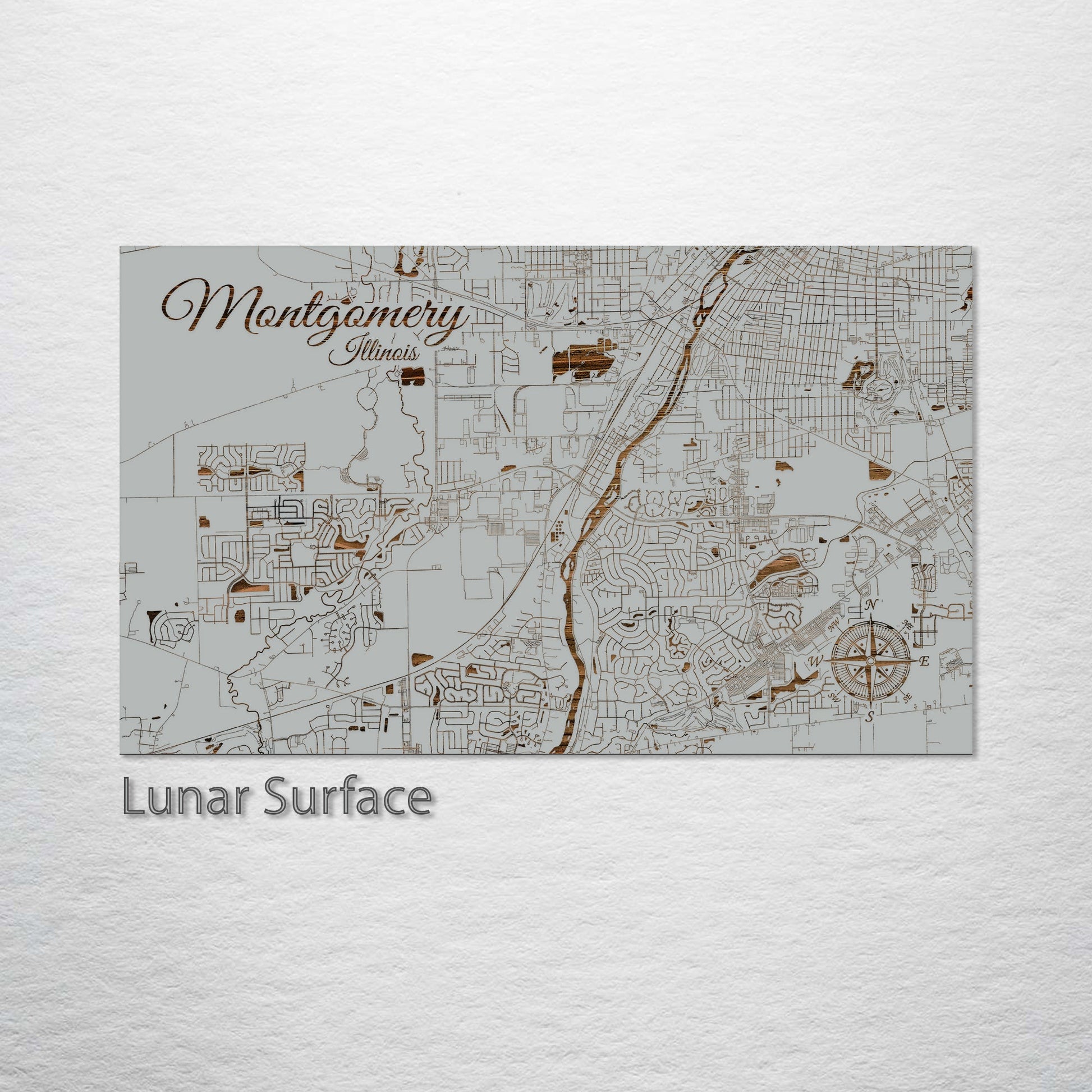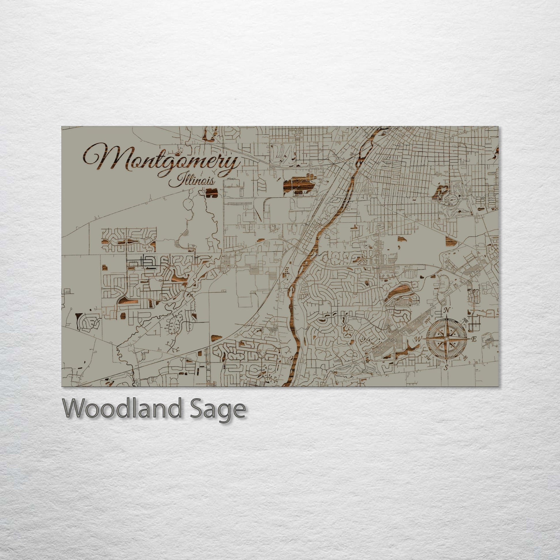 This is a street map of Montgomery, IL designed by Fire & Pine artists.