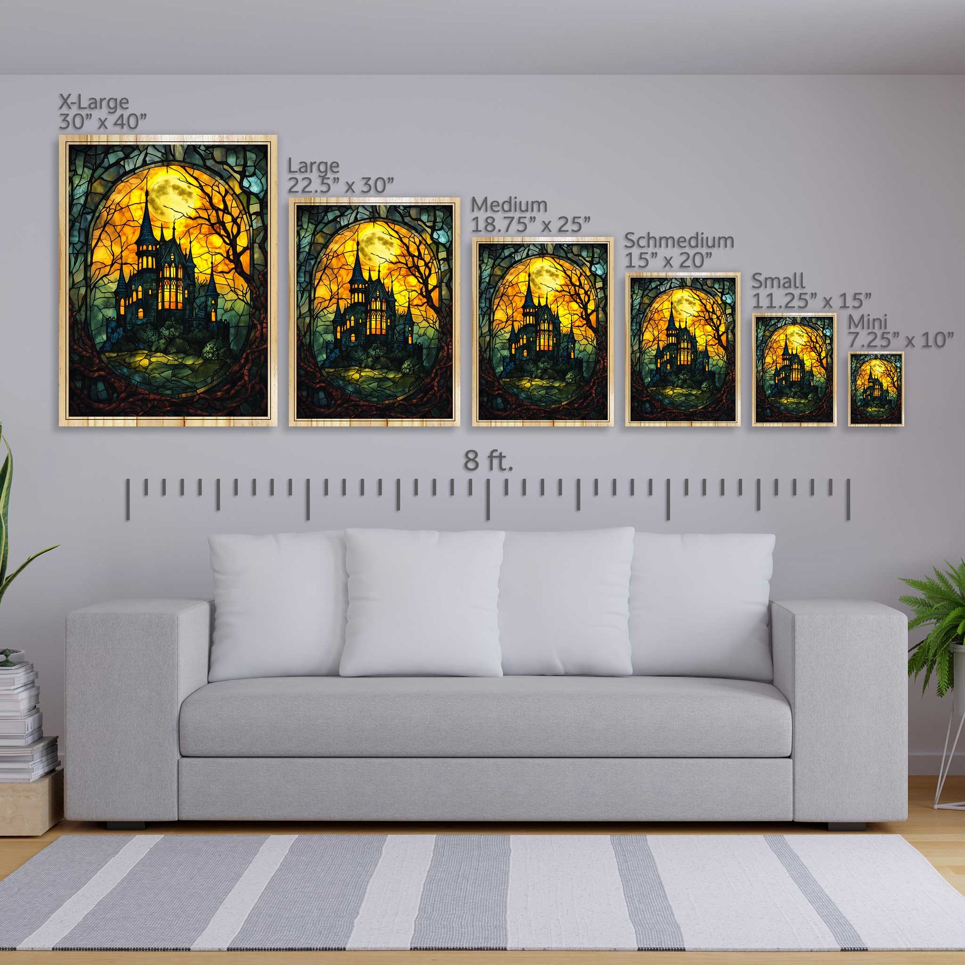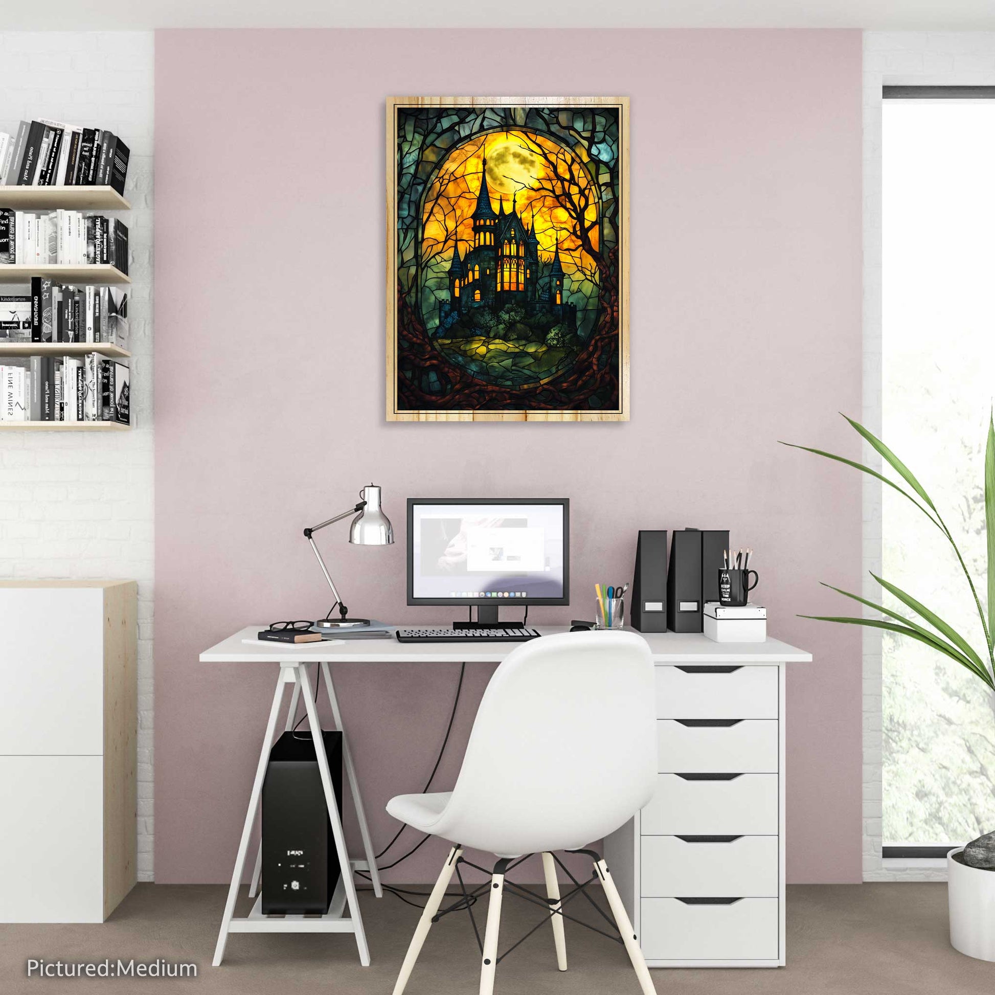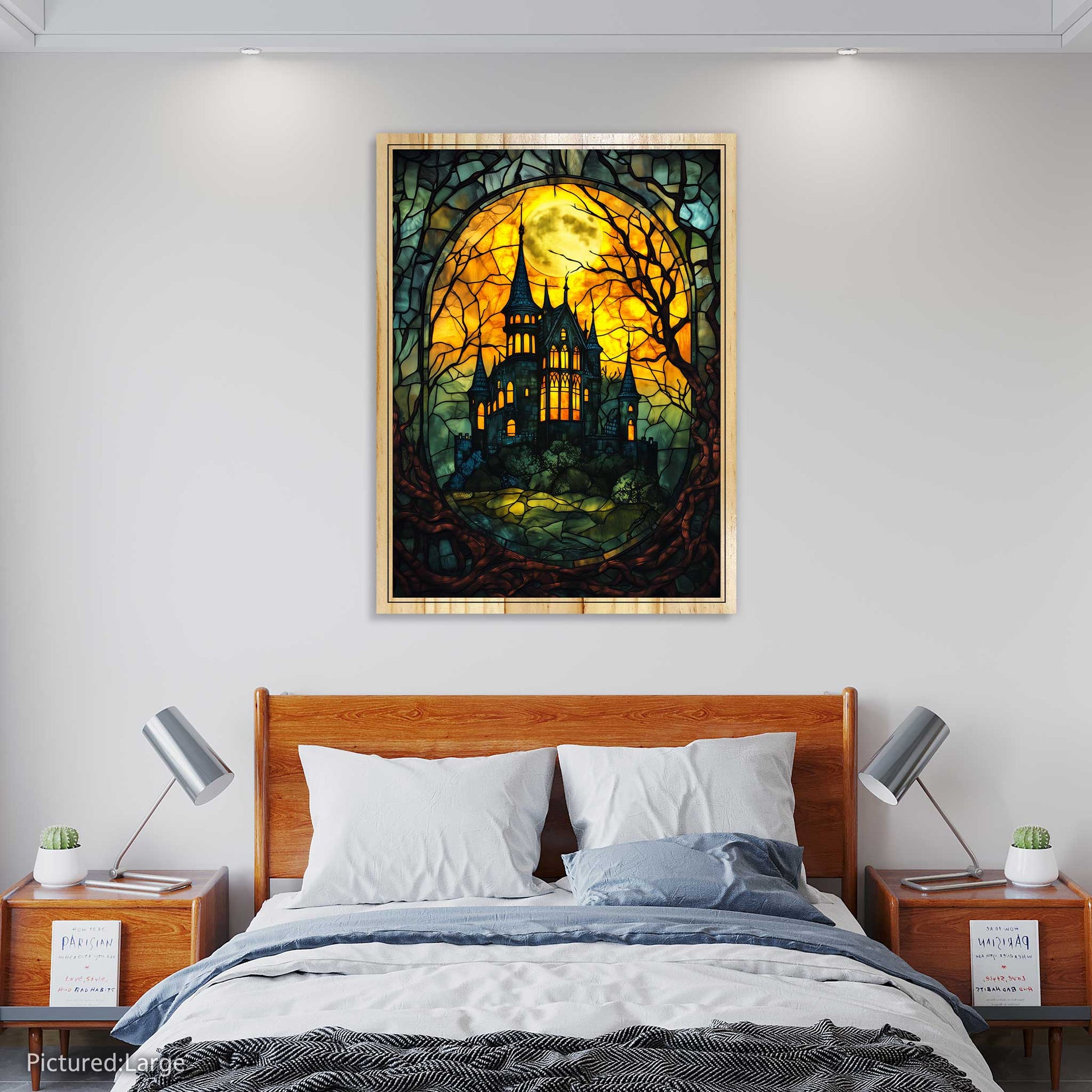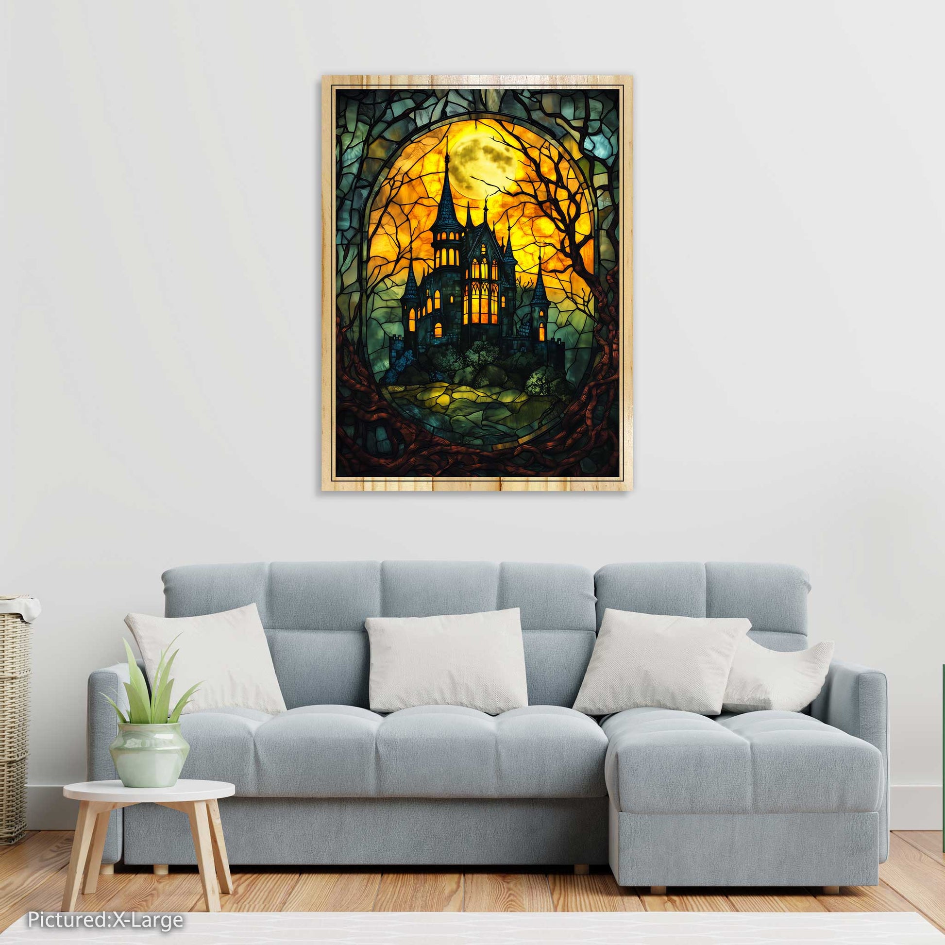 Step into a world of gothic mystery with our Haunted Castle artwork, masterfully presented on premium pine wood. Choose between a flat or elevated print style to complement your space and create the perfect eerie ambiance. Advanced printing techniques bring this enchanting stained-glass design to life, highlighting every detail from the glowing moonlit sky to the shadowed castle spires. Crafted on durable pine wood, this striking piece is built to last and will be a centerpiece for your décor year after year. Each print is carefully inspected for quality, ensuring you receive a product you’ll love.
