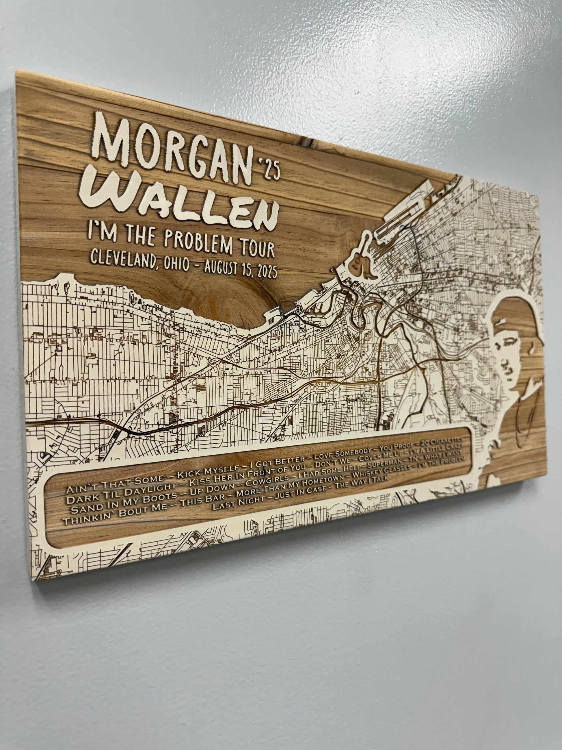 Memorialize your concert experience with a Limited Edition Morgan Wallen Limited Edition "I'm The Problem Tour" Setlist burnt wooden map.
