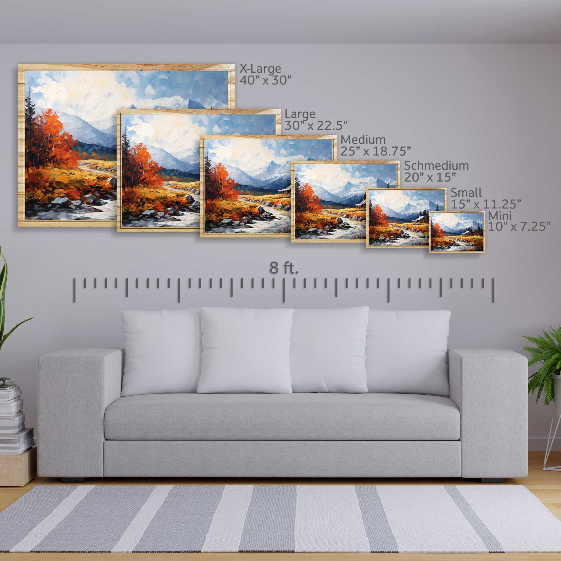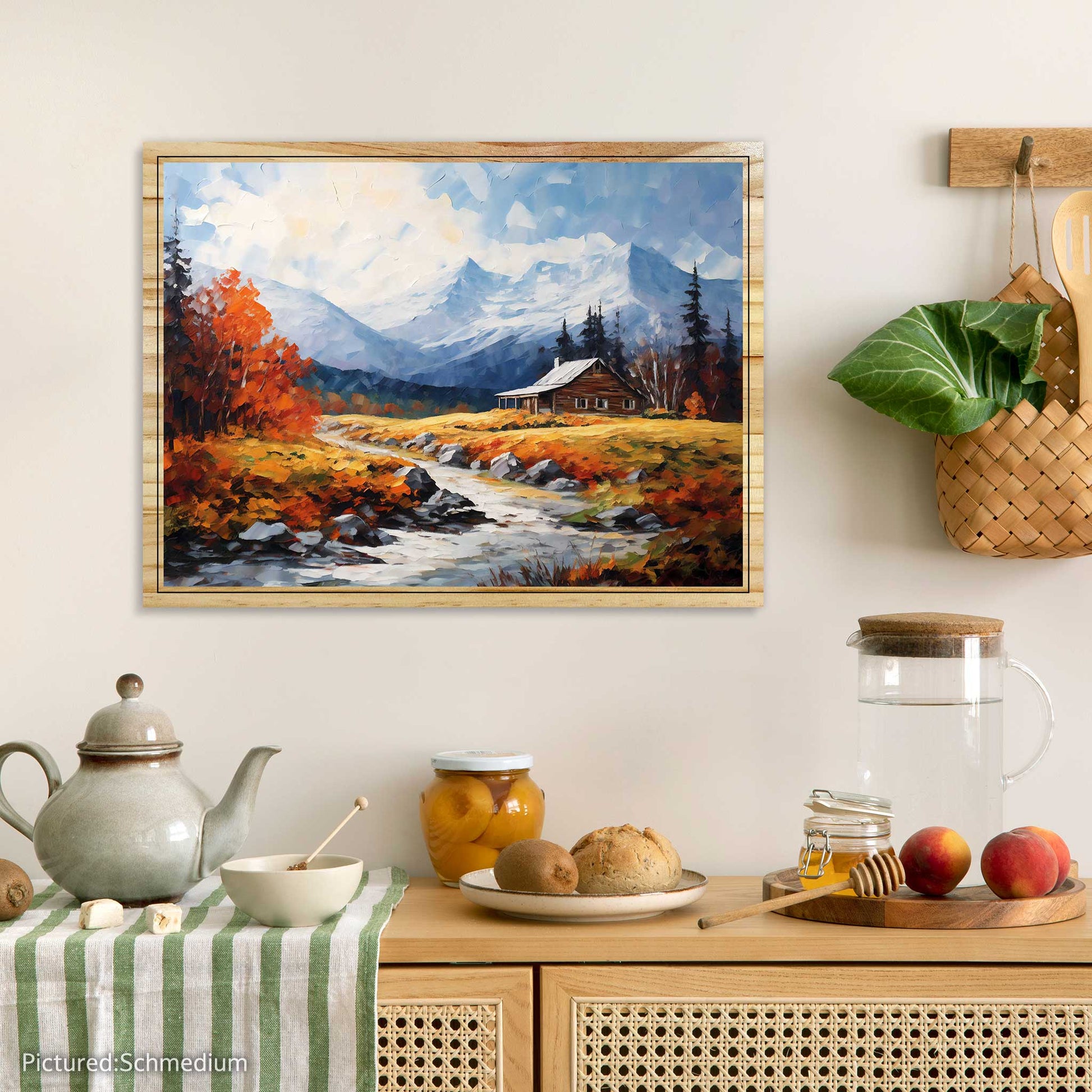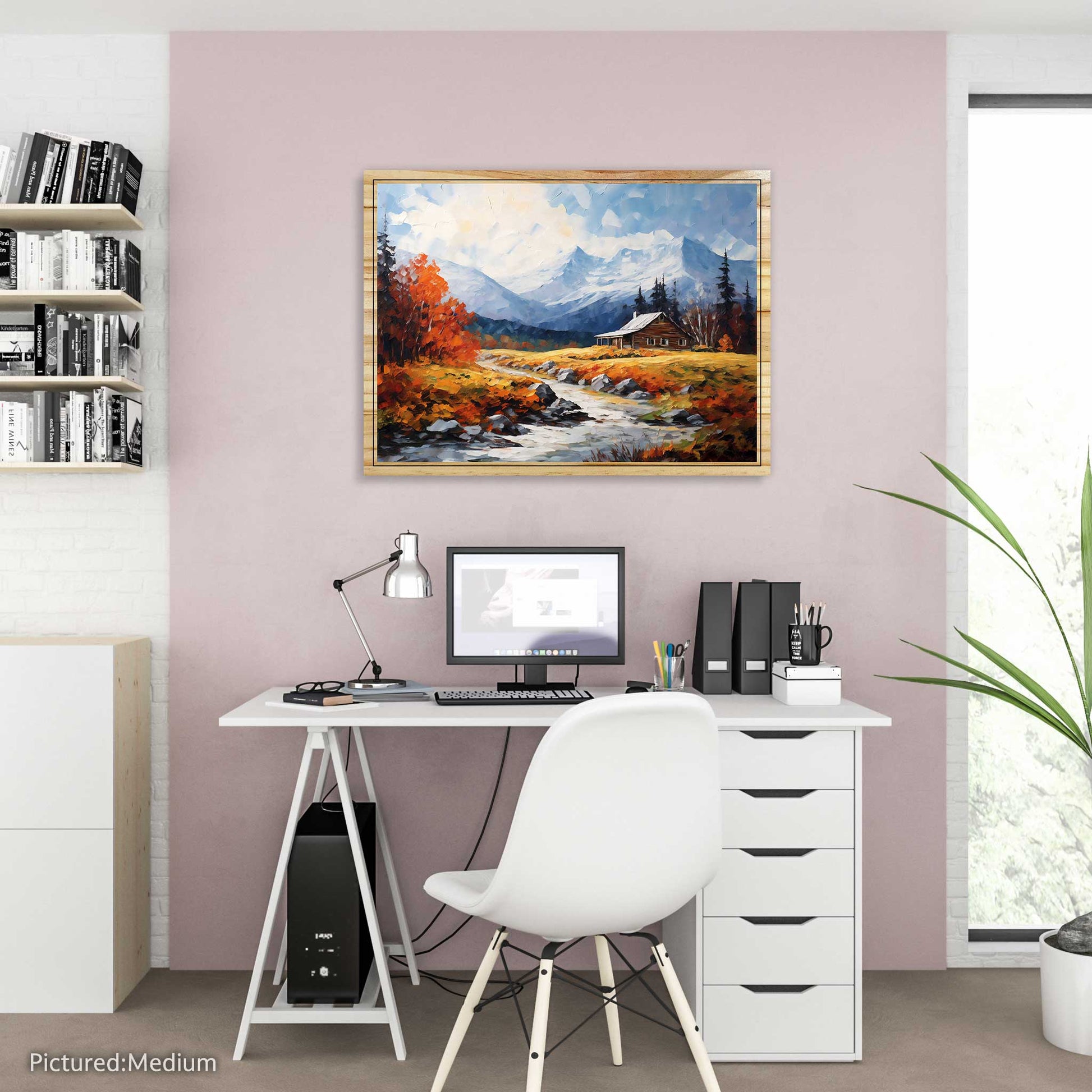 If you love the outdoors and the beauty of nature, you will love this painting of a mountainside landscape. The Mountainside artwork is a stunning piece of art that depicts a river running through a mountainous terrain. The painting is done in an impressionistic style, with bold brushstrokes and vibrant colors. The colors in the painting are predominantly orange, yellow, and blue, creating a contrast between the warm and cool tones. This painting is printed on high-quality pine wood, which gives it a natural and rustic look. You can choose between a flat print or an elevated print, which creates a 3D effect and makes the painting more realistic. The painting is framed in a light-colored wooden frame, which matches the style and elegance of the artwork. The Mountainside artwork is a great way to add some color and life to your home. It is also a wonderful gift for anyone who loves mountains and rivers. Don’t miss this chance to own this amazing painting today. You will be amazed by how it looks on your wall!