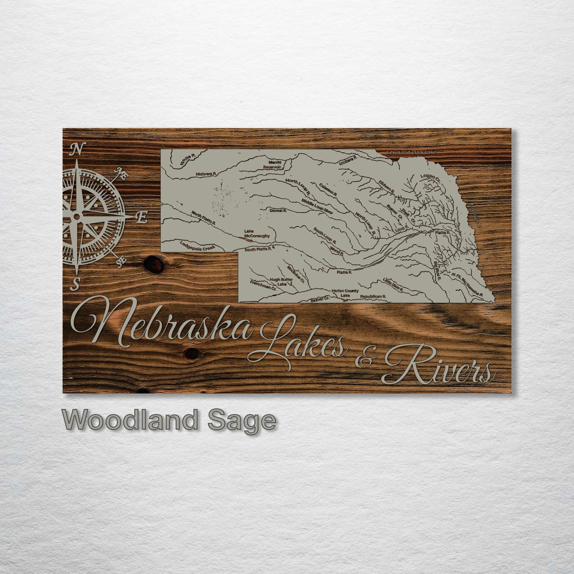 This is a map of the major lakes and rivers of Nebraska designed by Fire & Pine artists.
