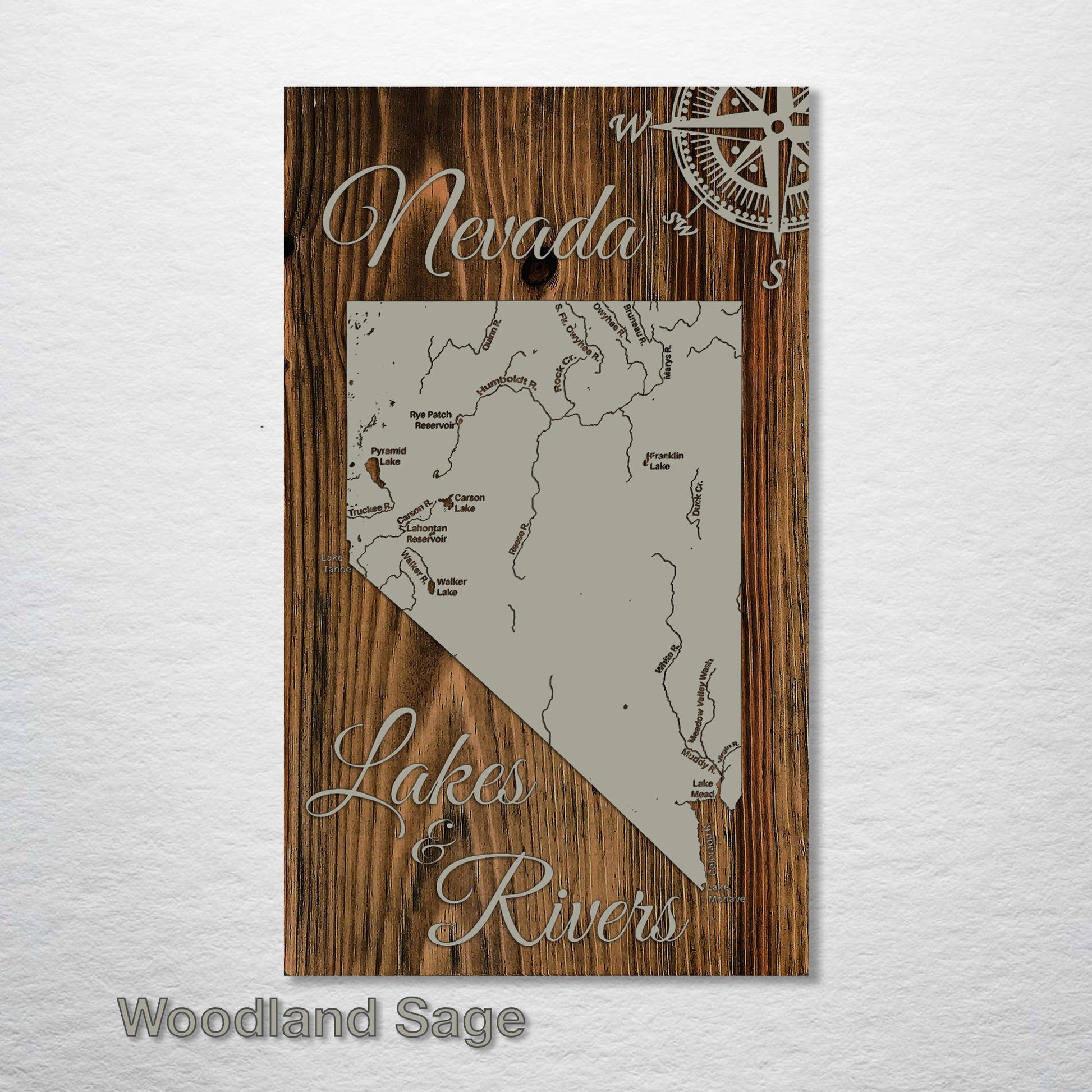 This is a map of the major lakes and rivers of Nevada designed by Fire & Pine artists.