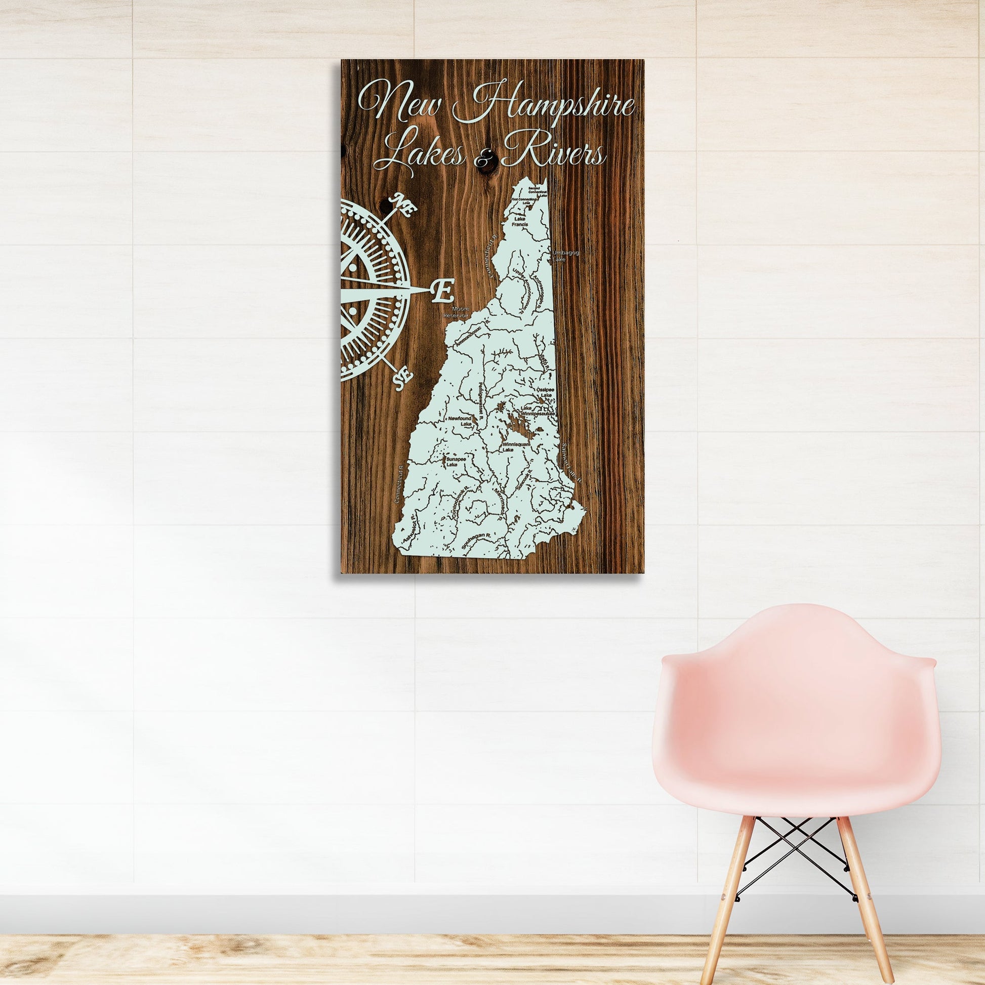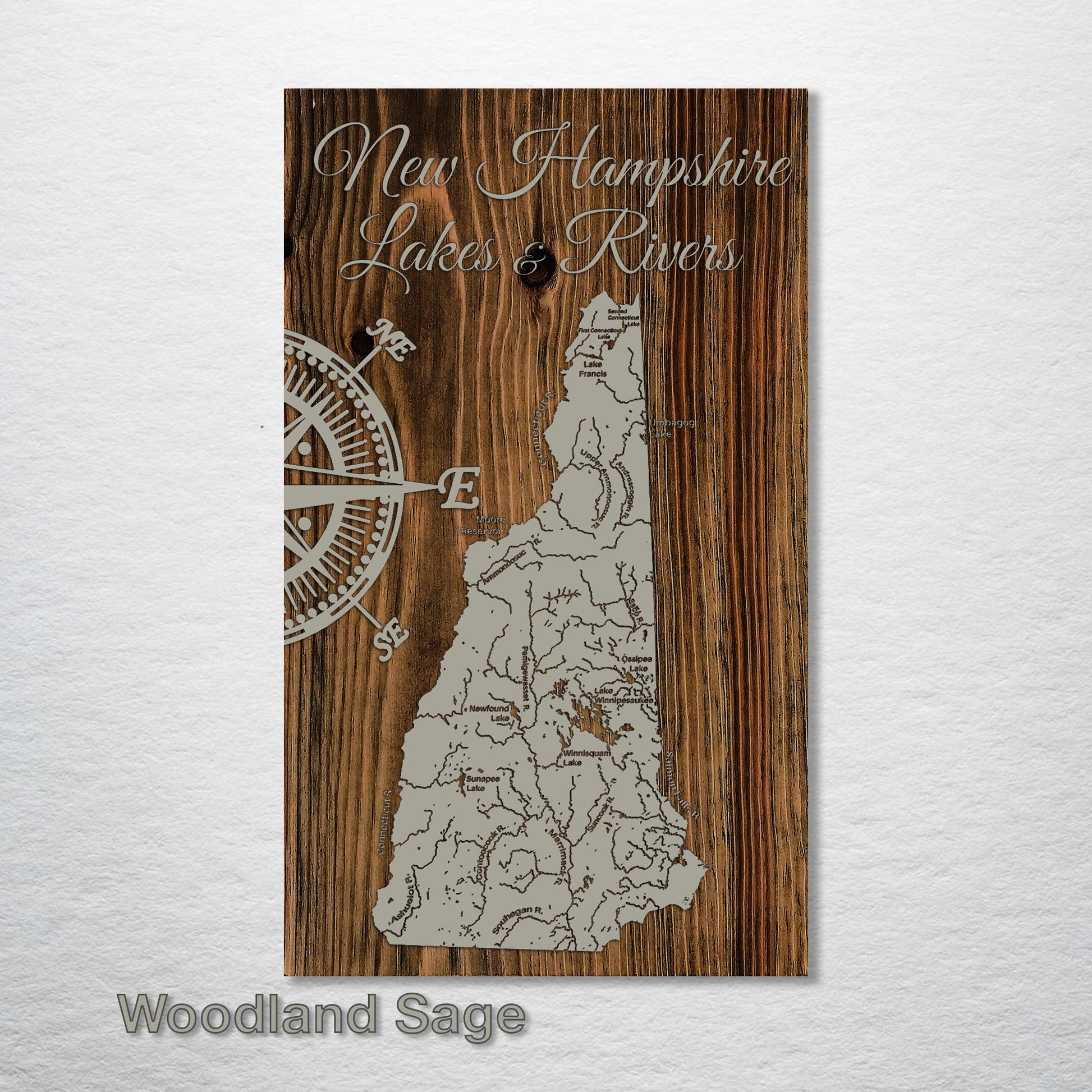This is a map of the major lakes and rivers of New Hampshire designed by Fire & Pine artists.