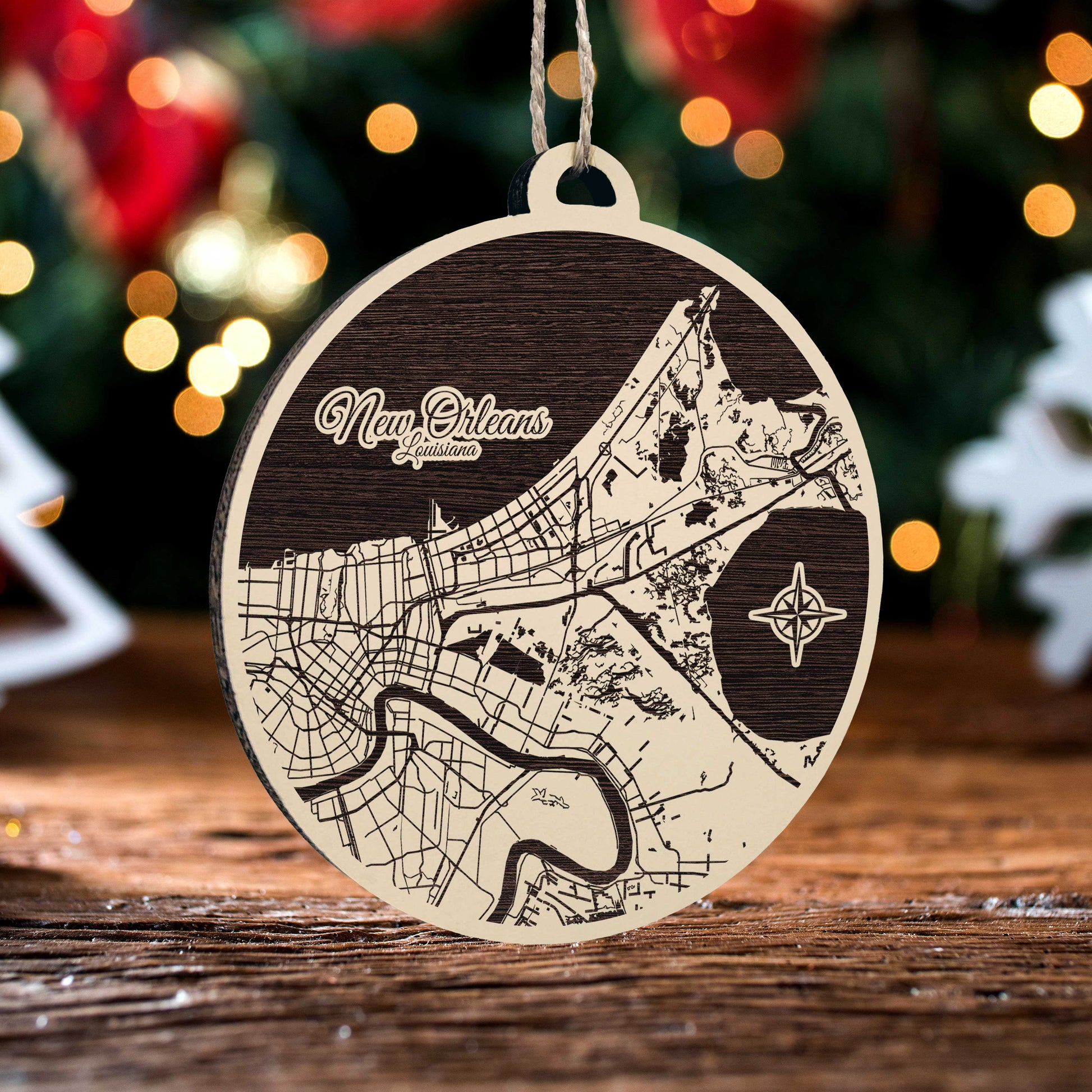 Enjoy New Orleans, Louisiana during the holidays with our handcrafted wooden map ornament! Sized at 4” x 5” and available in 6 color options, this ornament is meticulously carved from premium pine wood, featuring New Orleans, Louisiana's unique layout. It's an artistic blend of memory and decor, ideal for the holidays or as a treasured memento.