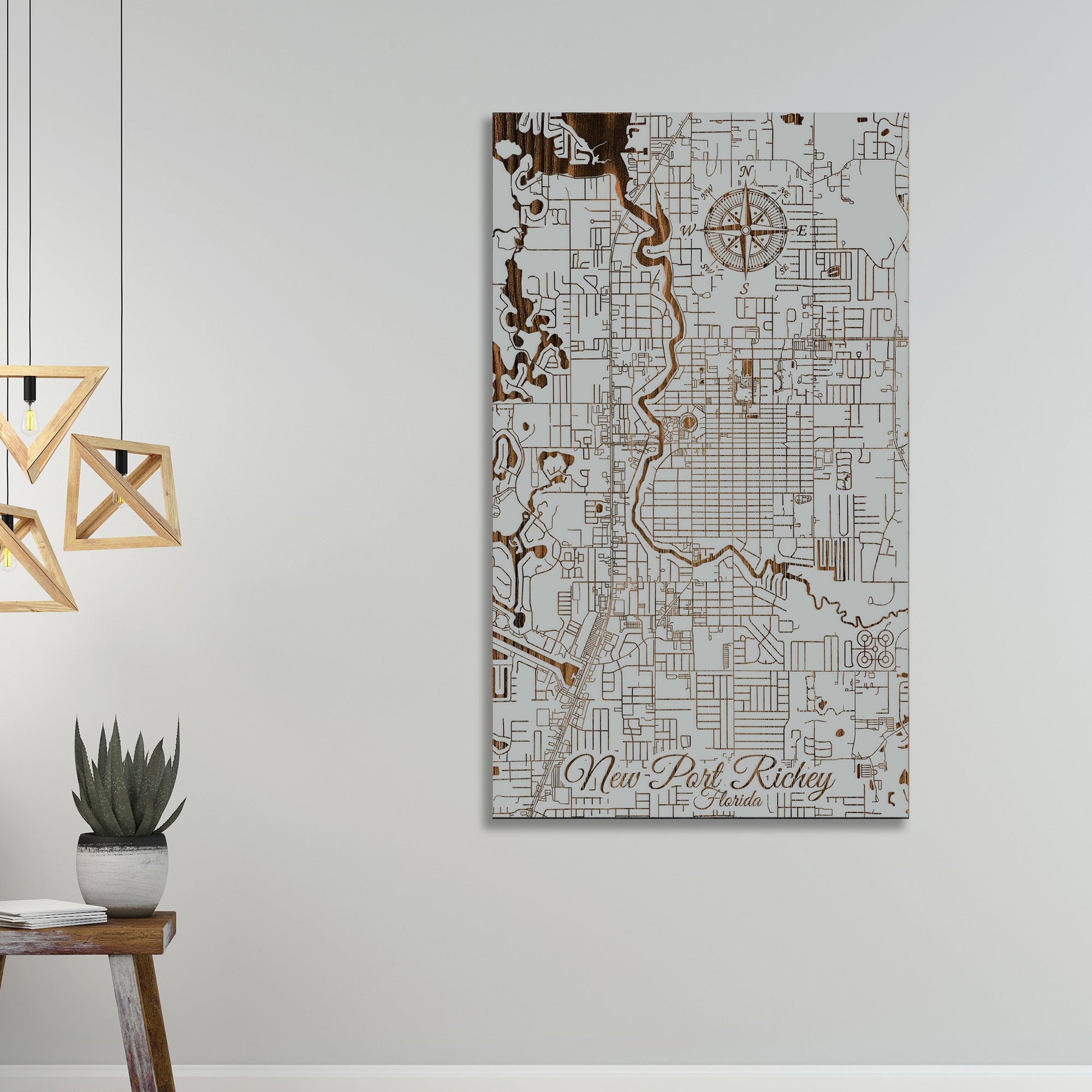 Distinctive Art for Map Lovers: The New Port Richey, Florida street map is a beautifully wood-engraved piece, perfect for any art collection. Its craftsmanship in high-grade pine wood highlights the intricate street patterns of New Port Richey, creating a visually appealing and unique artwork.