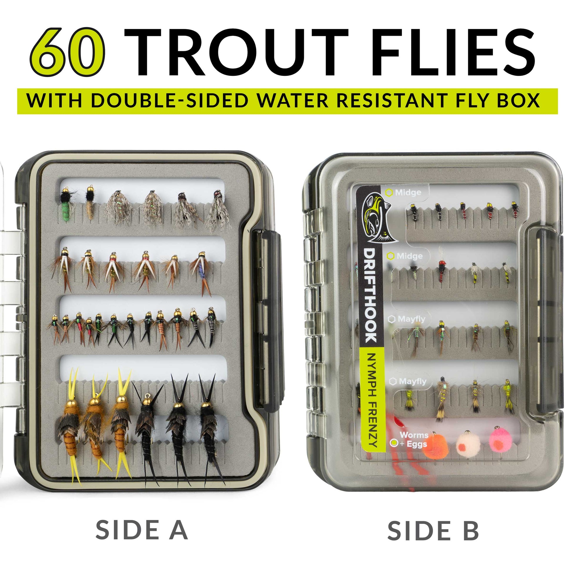 - 60 hand-tied Fly Fishing Nymph Flies – that’s 60 done for you trout flies