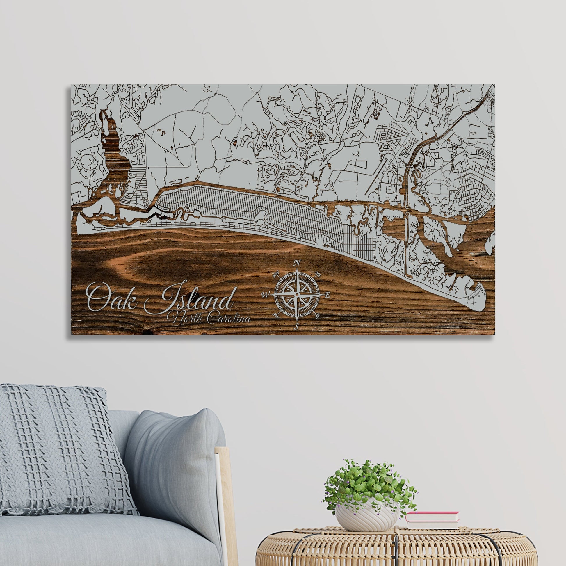 Distinctive Gift for Geography Enthusiasts: This wood-engraved Oak Island, North Carolina street map is a remarkable piece for any art or geography enthusiast's collection. Made from high-grade pine wood, this map art intricately details the unique street layout of Oak Island, presenting a visually striking artwork. It's perfect for those who appreciate the blend of geographical precision and artistic presentation.
