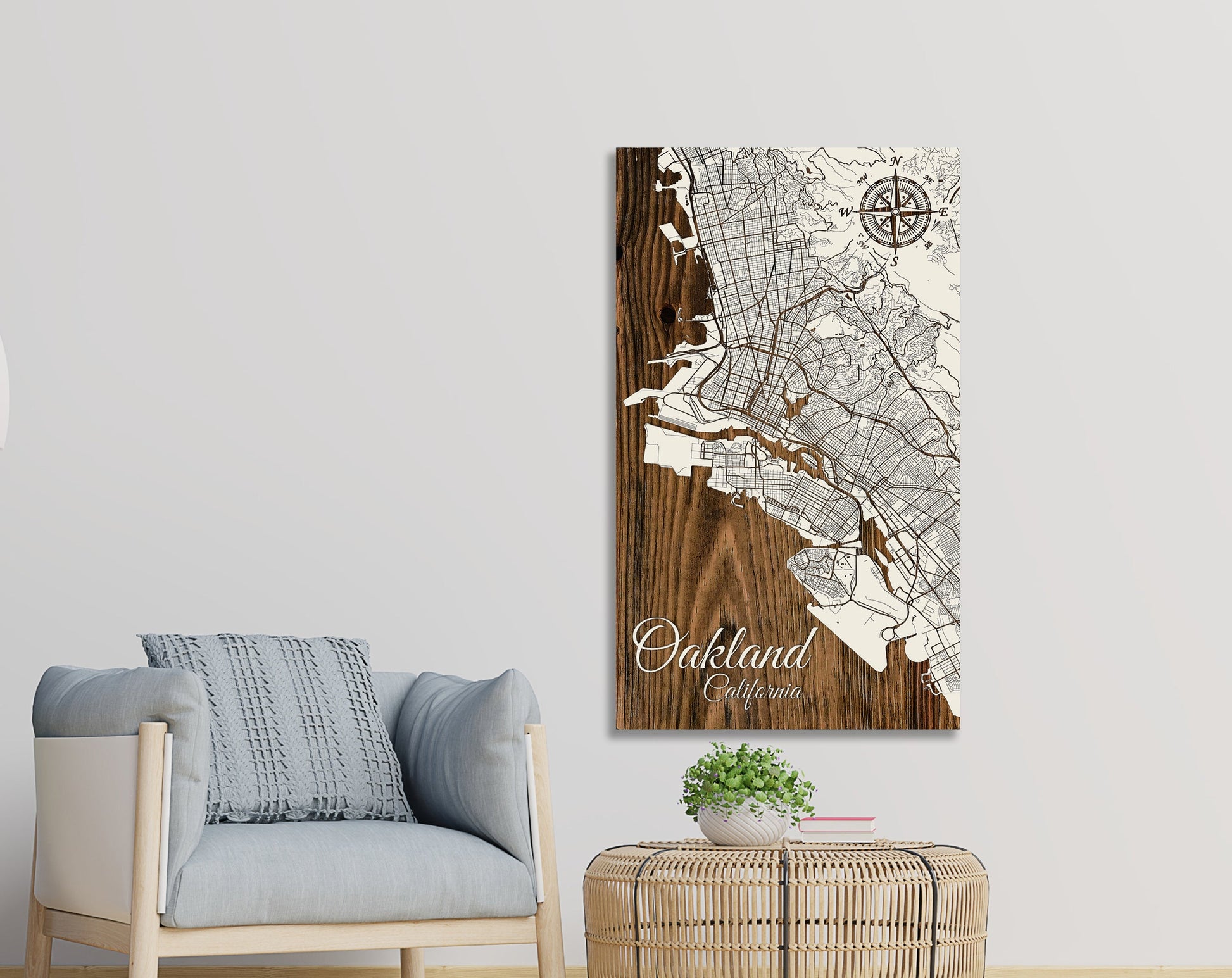 This Oakland, California street map is made from durable pine wood and engraved to reveal the city's intricate street layout and notable landmarks. Ideal for anyone who appreciates Oakland's diverse culture and history.