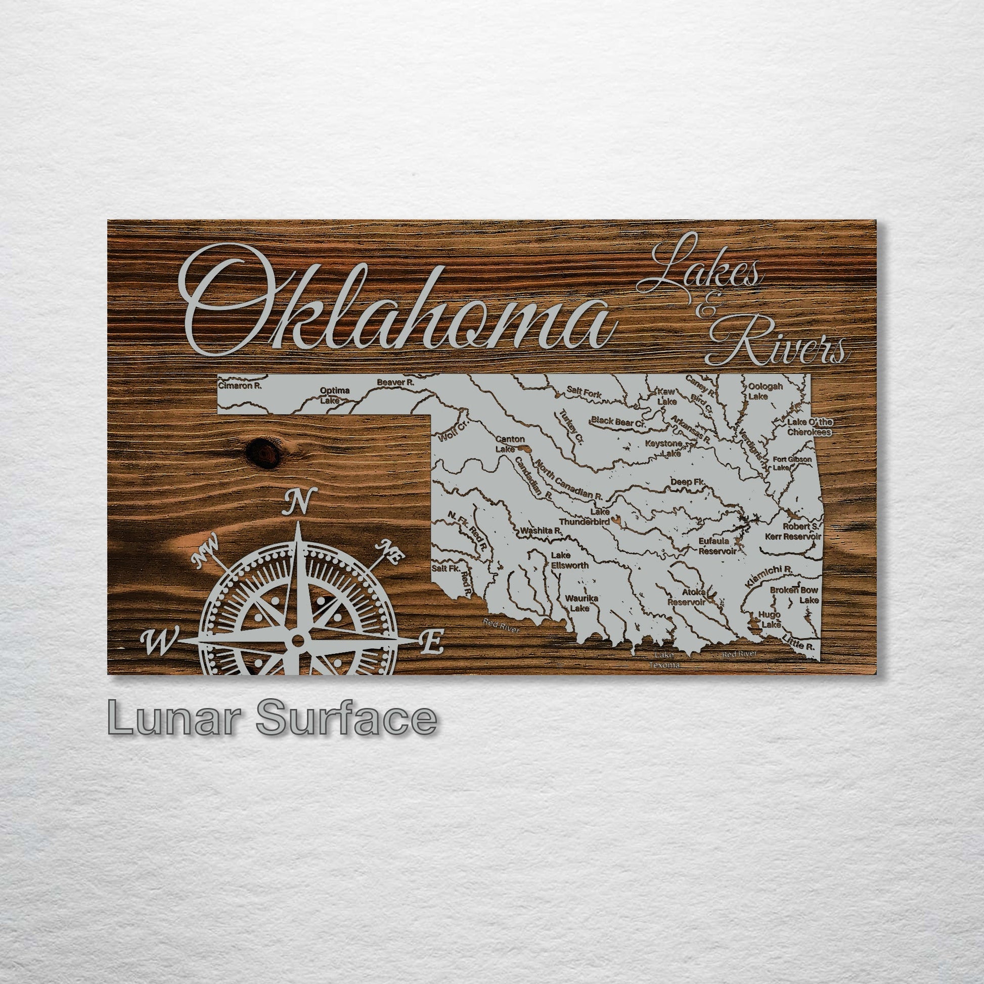 This is a map of the major lakes and rivers of Oklahoma designed by Fire & Pine artists.