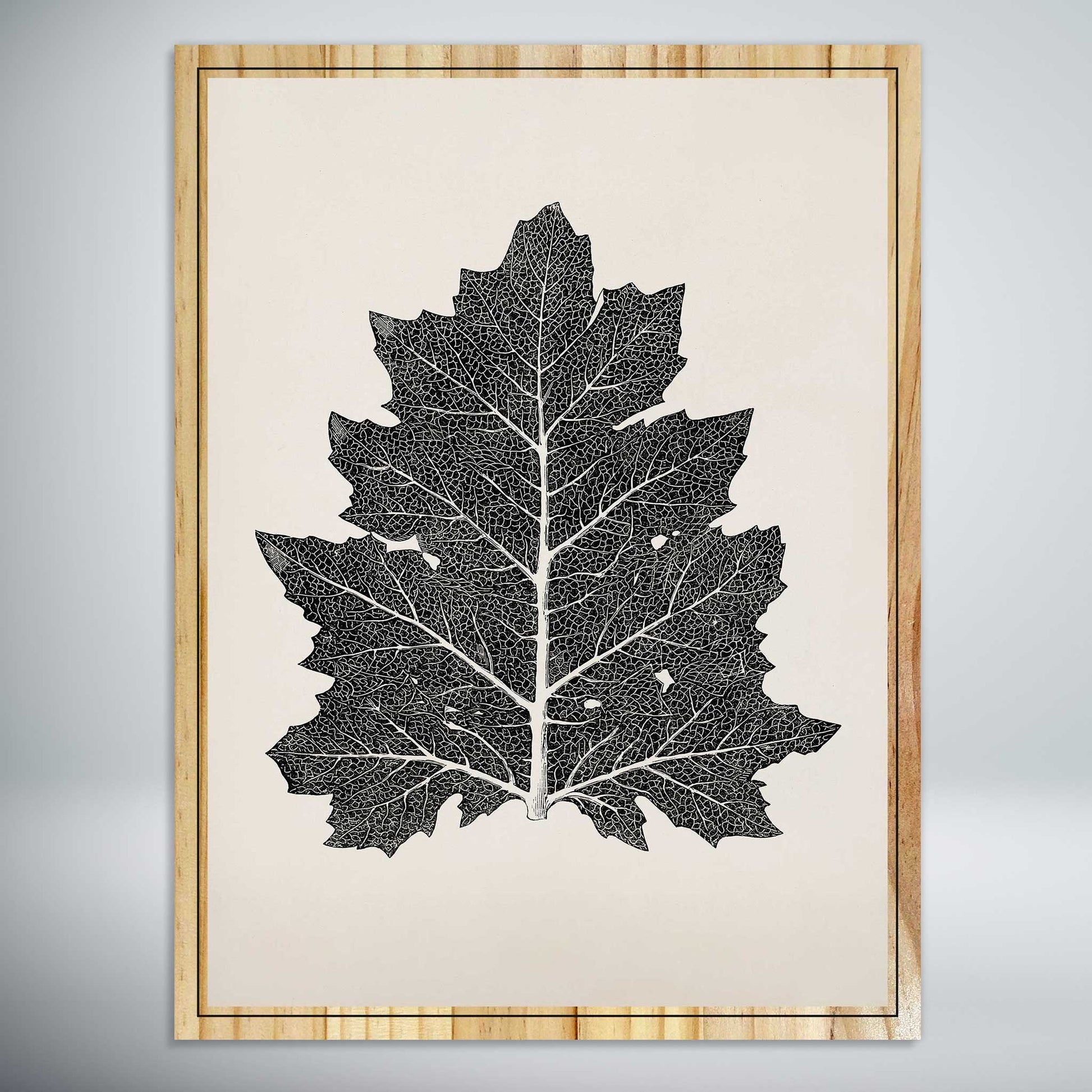 Imprinted on robust pine wood, this piece vividly captures the intricate details of a single leaf, encapsulating the inherent beauty of its structure and veining.