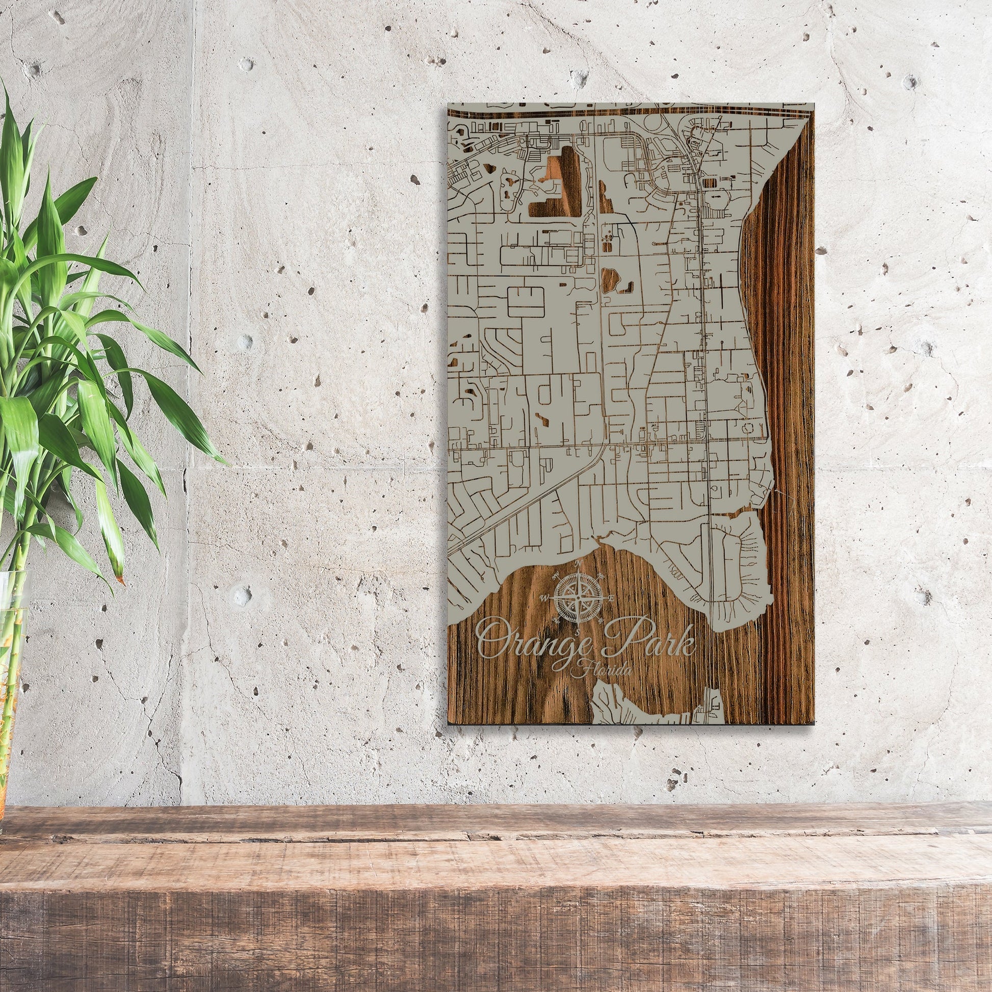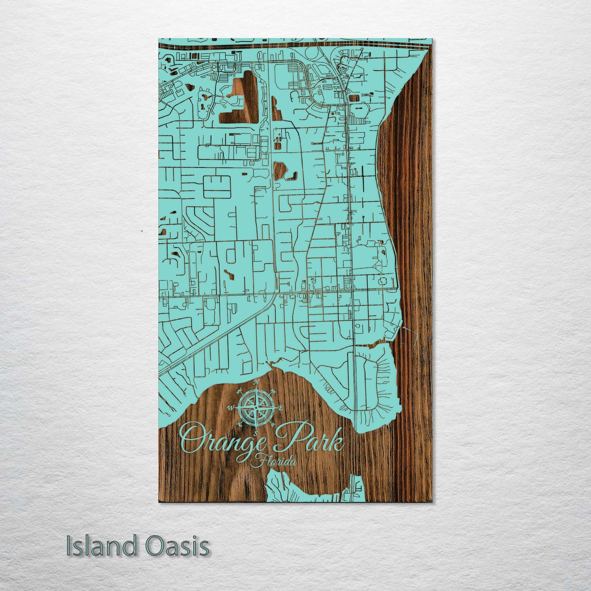A Masterpiece for Map Enthusiasts: This wood-engraved Orange Park, Florida street map is an exceptional addition to any collector's assortment. Crafted from high-quality pine wood, it brings the intricate details of Orange Park's streets to life, creating a standout work of art. It's the perfect choice for those who have a passion for maps and cityscapes.
