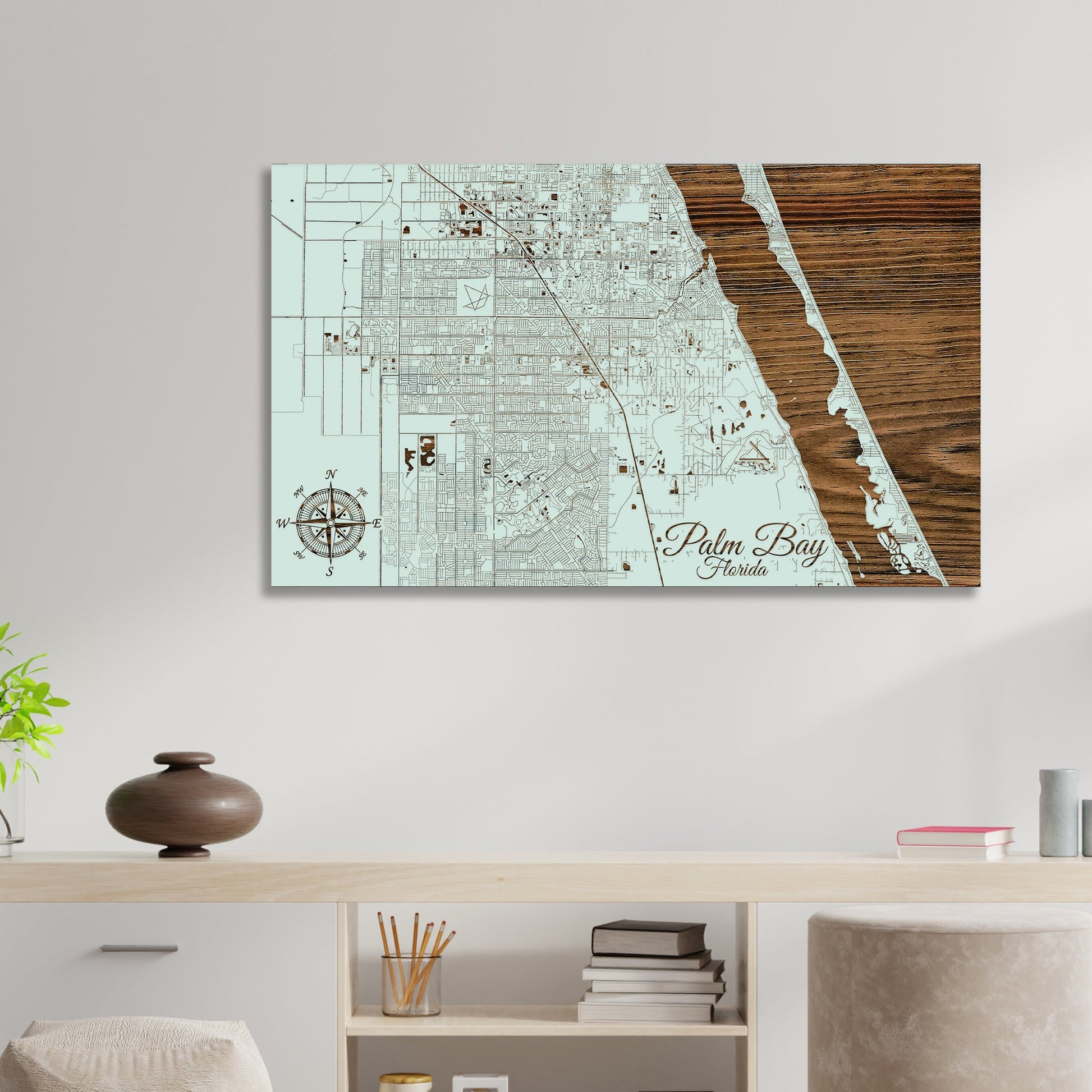 Unique gift for cartography enthusiasts: Revel in the allure of Palm Bay, Florida with this laser-engraved street map art, meticulously designed on select pine wood. It showcases unparalleled craftsmanship that delineates intricate details, offering an arresting piece for those fond of geographical studies or the Sunshine State.