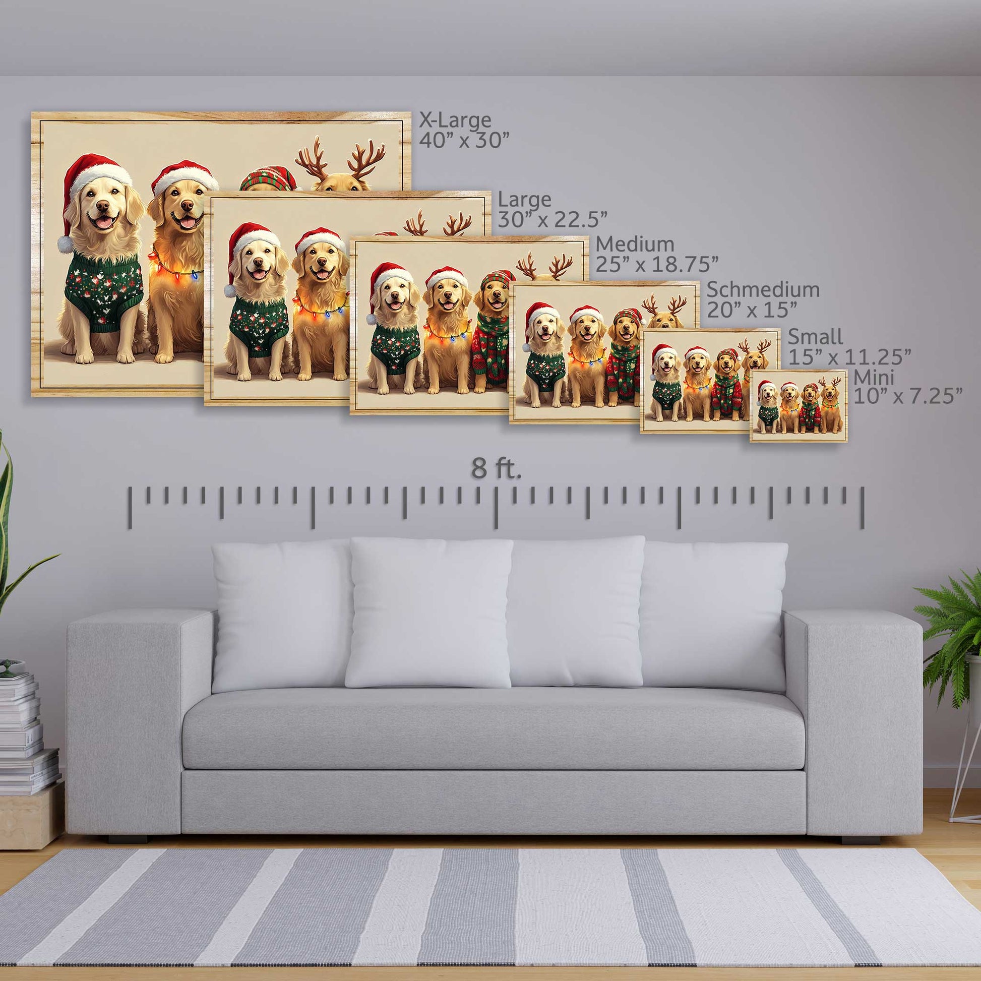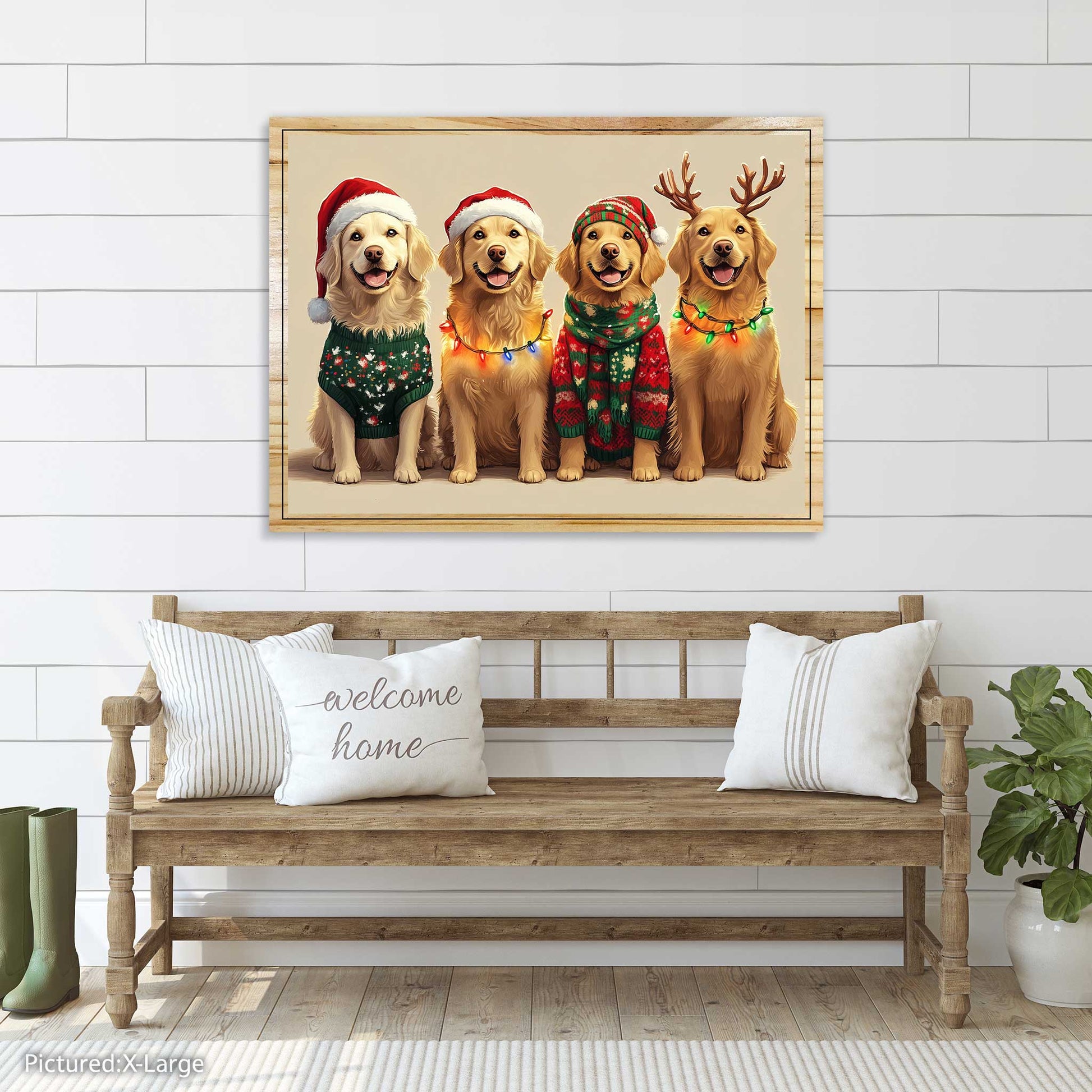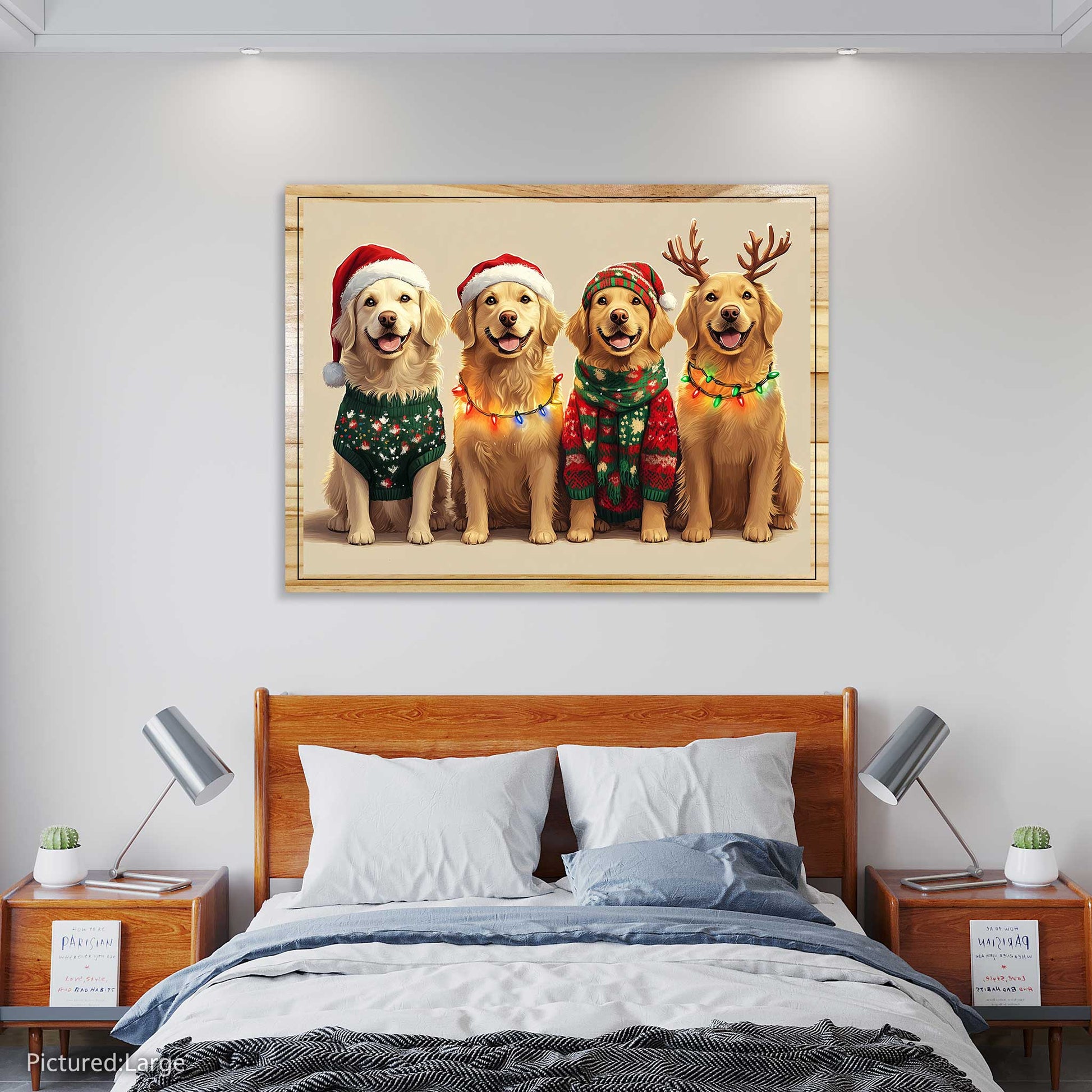 Bring home the heartwarming happiness of the holidays with our Festive Golden Retrievers pine wood art print — a joyful reminder that the best gifts often have fur and wagging tails.
