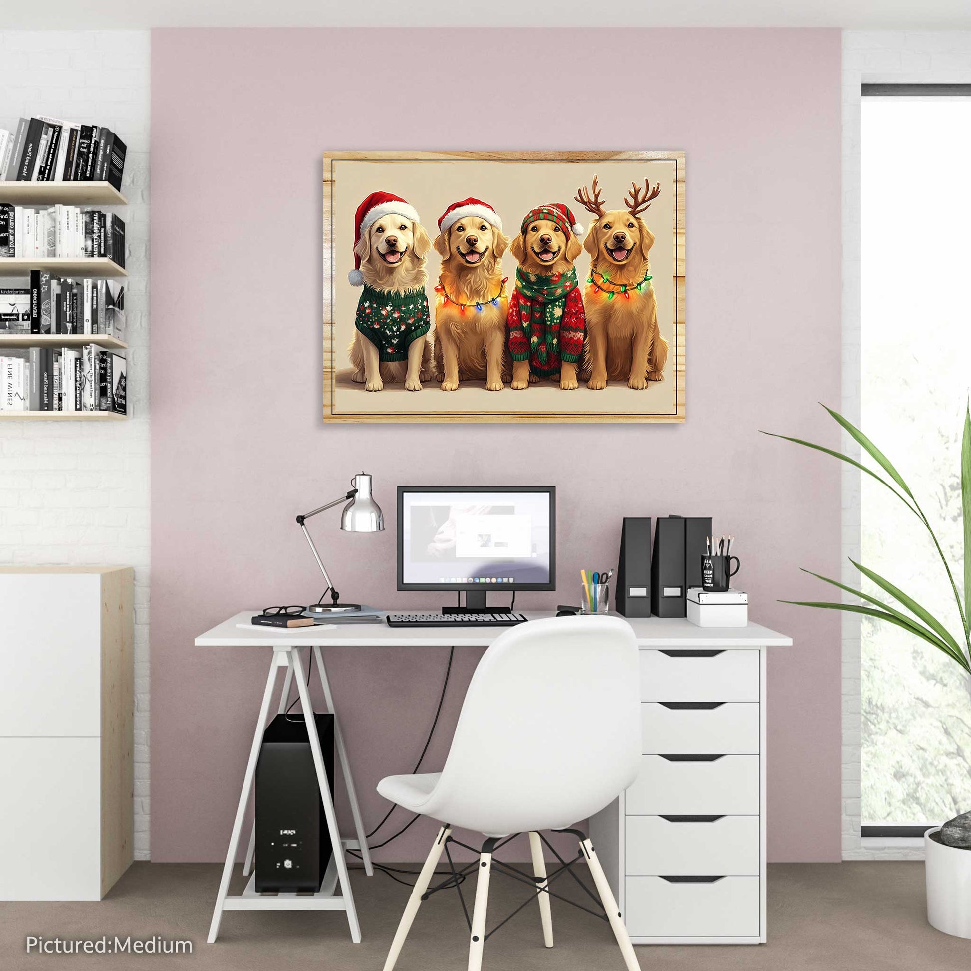 Celebrate the joy of the holidays with our Festive Golden Retrievers art print, featuring four cheerful pups dressed in cozy Christmas attire. From twinkling lights and Santa hats to reindeer antlers and colorful sweaters, these golden friends embody the spirit of love, laughter, and togetherness that makes the season bright.