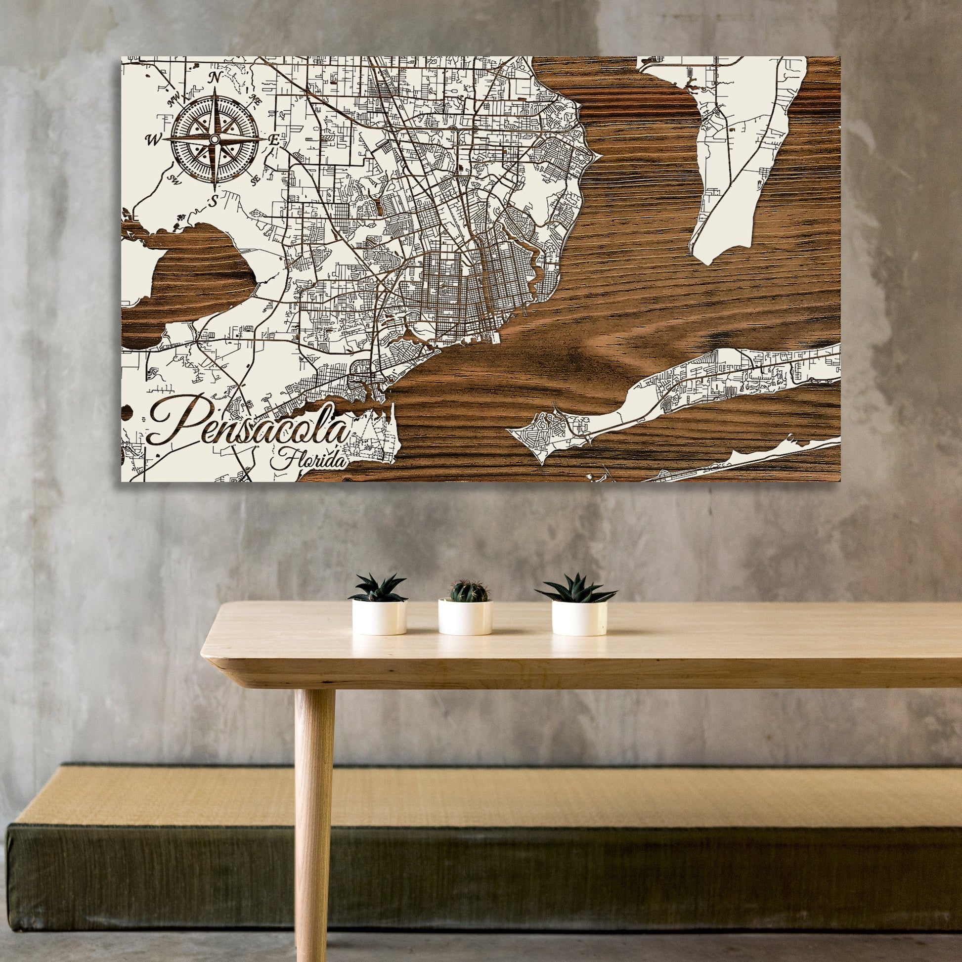 Unique gift for Art Lover: This Florida Pensacola Street Map wood engraved wall art is an exceptional addition to any collector's lineup. Crafted from high-quality pine wood, the intricate details are brought to life, making it a standout piece. Ideal for anyone interested in Unique wall art decor.