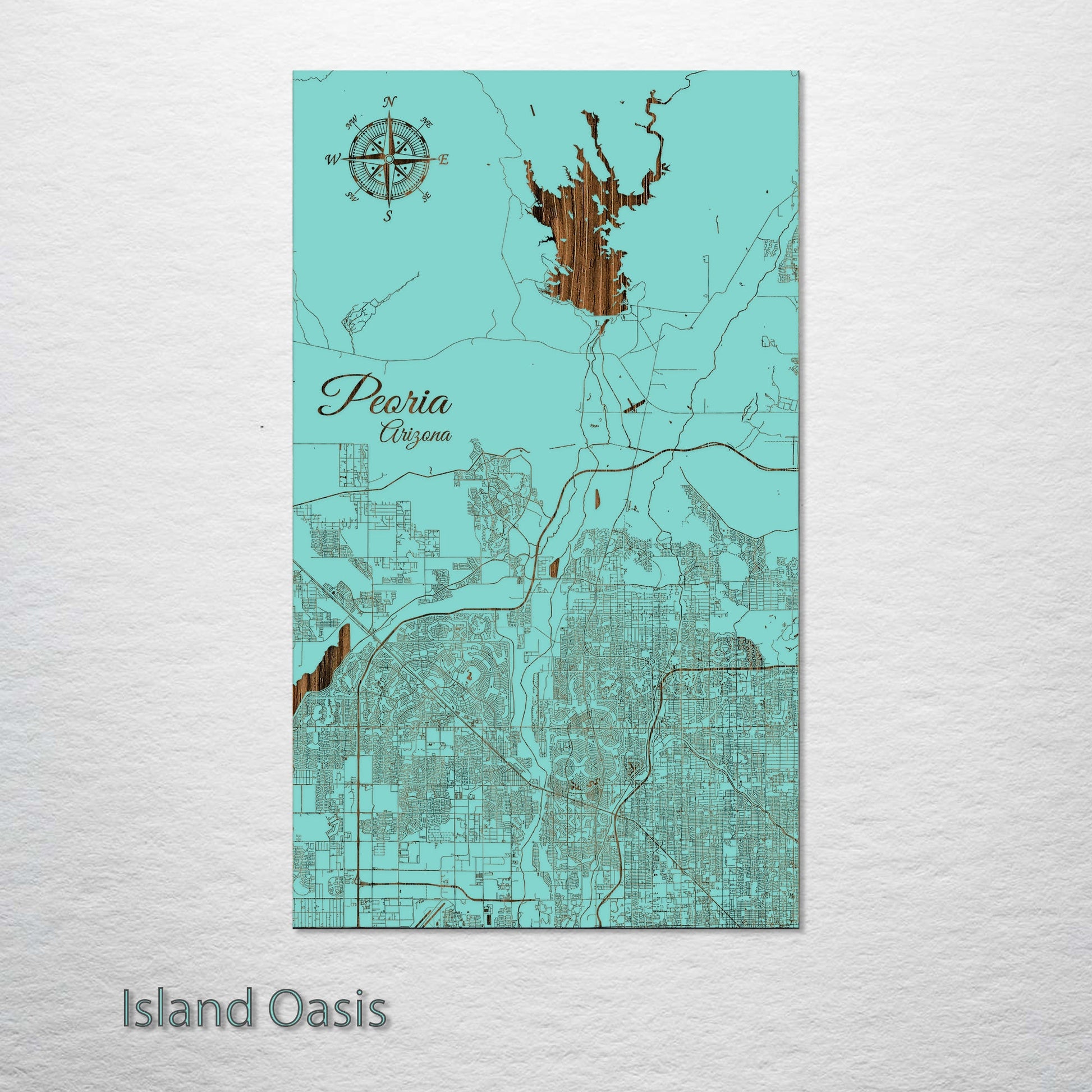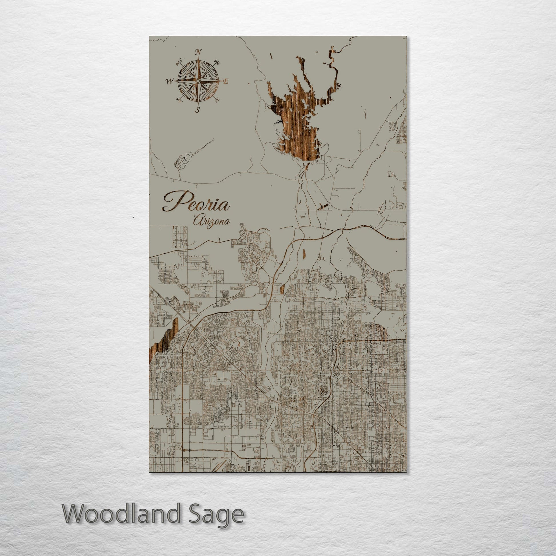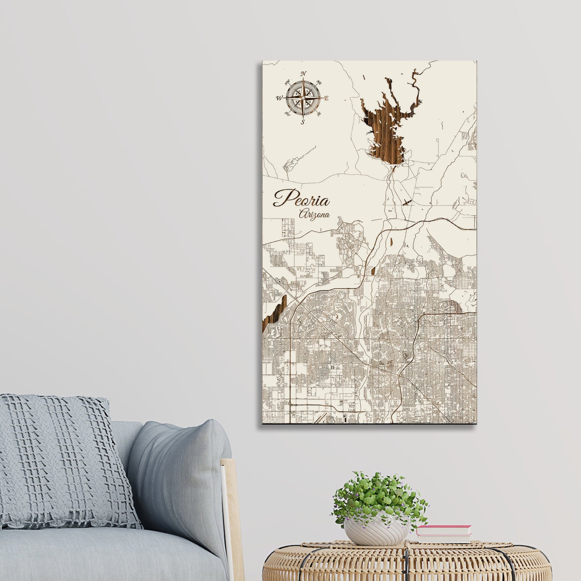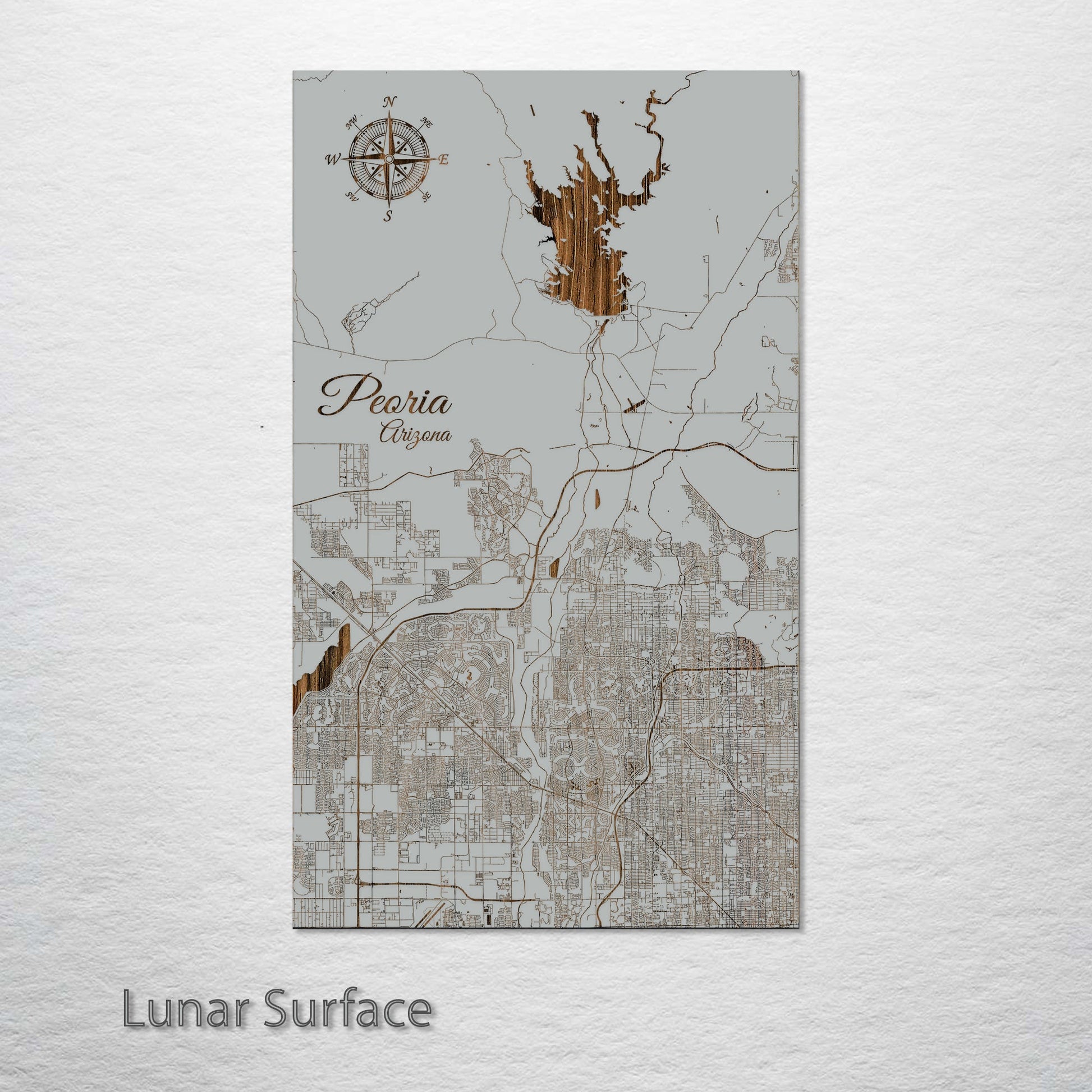 Unique gift for Peoria aficionados or map enthusiasts: This engraved street map of Peoria, Arizona is an artfully crafted piece, meticulously detailed on high-quality pine wood. The map displays the road layout of Peoria, appealing to anyone with a connection to the city or an appreciation for cartography.