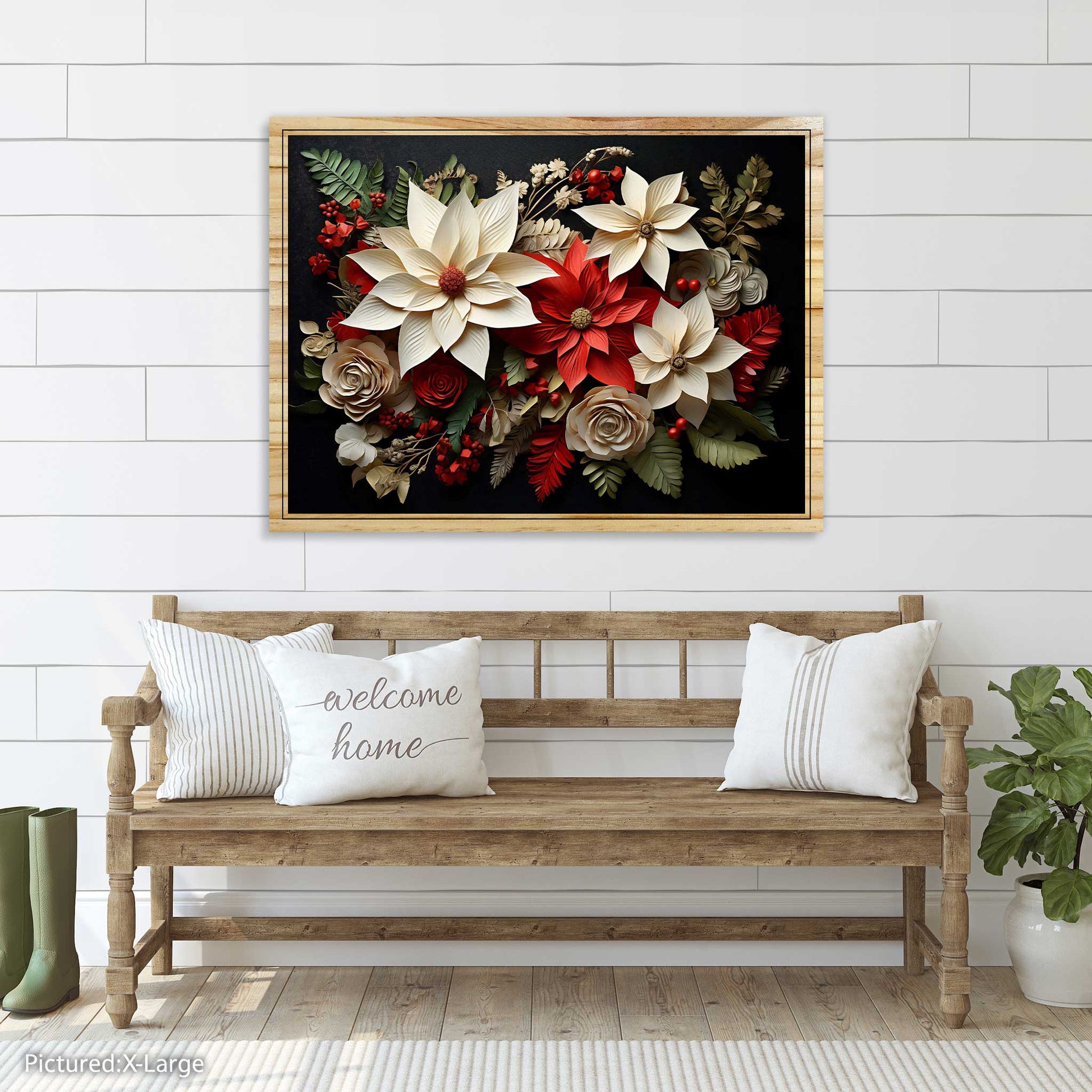 This print of a poinsettia bouquet is a great way to add some holiday color to your home. It’s printed on high-quality pine wood and has a wooden frame. You can choose between a flat print or an elevated print that has a 3D effect. The elevated print makes the flowers and the leaves look more realistic and detailed. This print is a beautiful product that will brighten up your space.