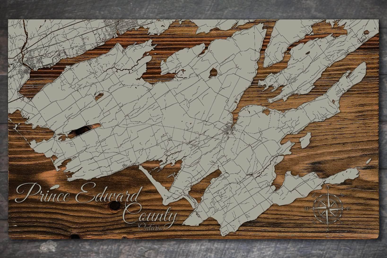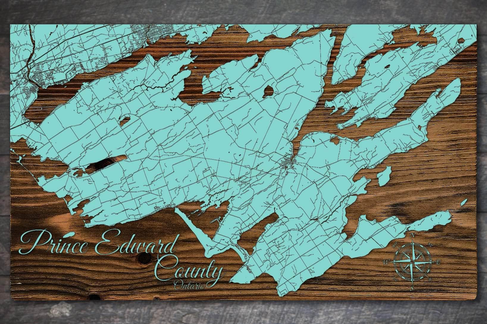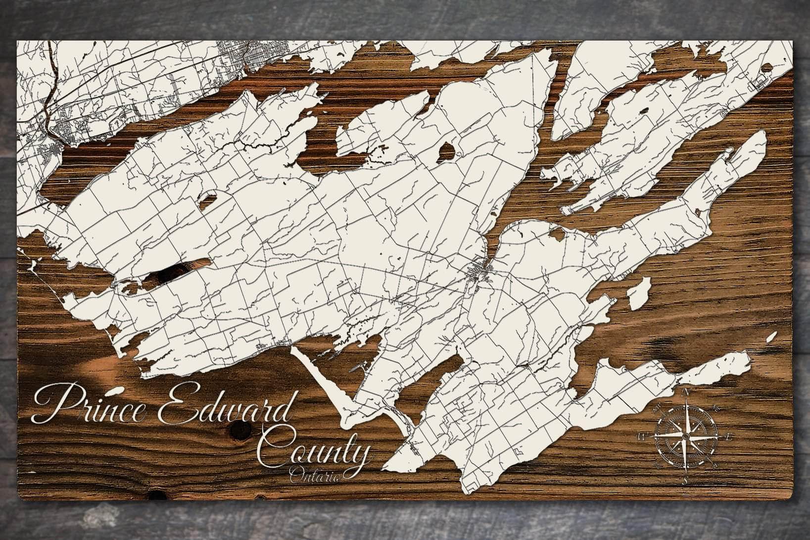 This is a custom map showing Prince Edward County in Ontario, Canada designed by Fire & Pine artists.