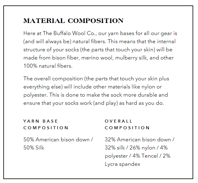This sock has a terry loop cushioned footbed, vented and structured instep for a smooth fit, terry loop 4" x 4" shin pad and just enough spandex to hold it above your 12" boot top...but not enough to cut down circulation. Nylon over-plaited in the toe and way up past the heel for long smooth wear. Seriously warm. Surprisingly soft. The perfect sock for your ski boots, heavy winter snow boots or city rain boots. You will feel the difference that bison can make in your socks.
