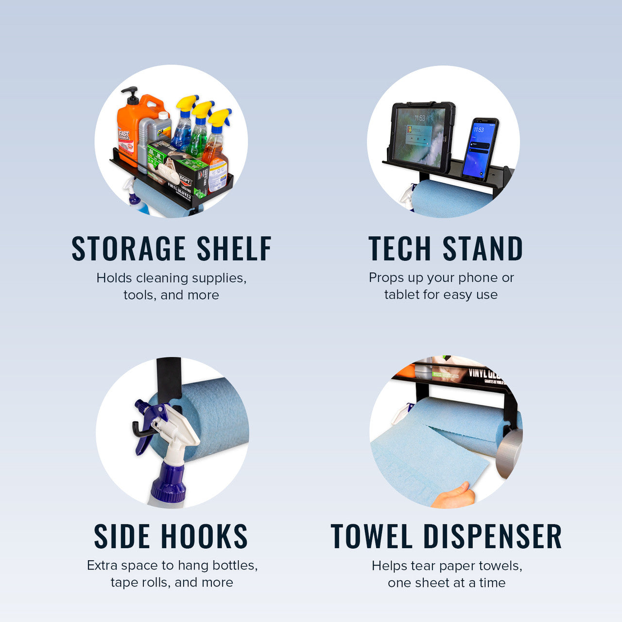- Holds cleaning supplies, gloves, hardware, and more