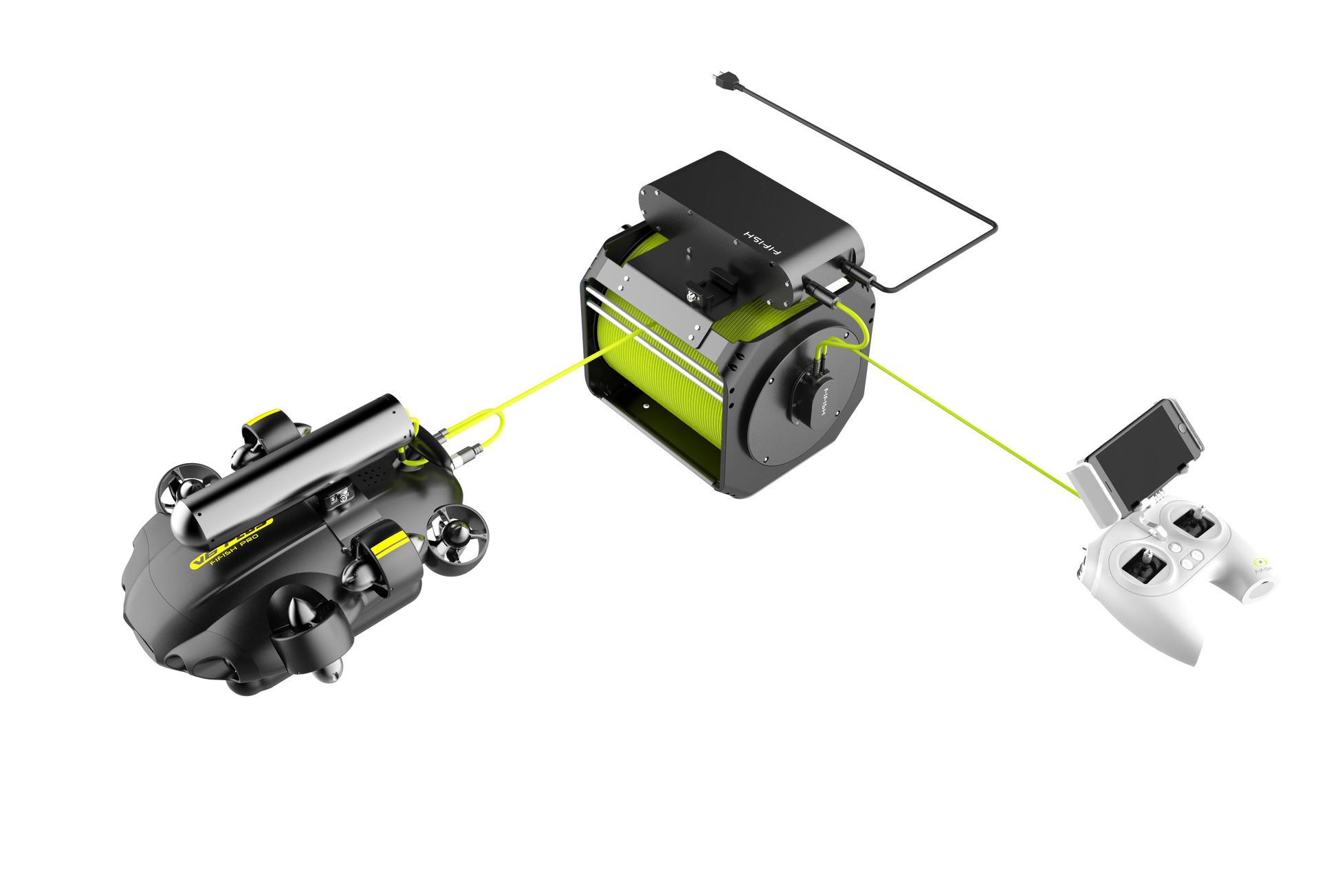 The system comes with a 200-meter tether a spool, one onshore power management module that is fixed atop of the spool, and one underwater charging module that is firmly installed onto the top of the Fifish.