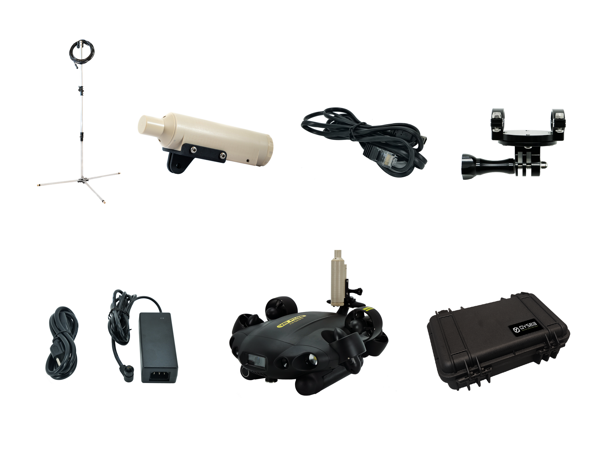 Especially designed for the new Fifish Pro V6 Plus underwater drone, the U-QPS comes with three pieces of hardware: the Master-D1 positioning computer board that runs the web GUI and API, also known as the "Topside" comes in an hardshell industrial case; the transmitter that is fixed atop the underwater drone, the "Locator"; and the baseline Antenna that, when submerged in water, receives the acoustic signals emanating from the Locator.